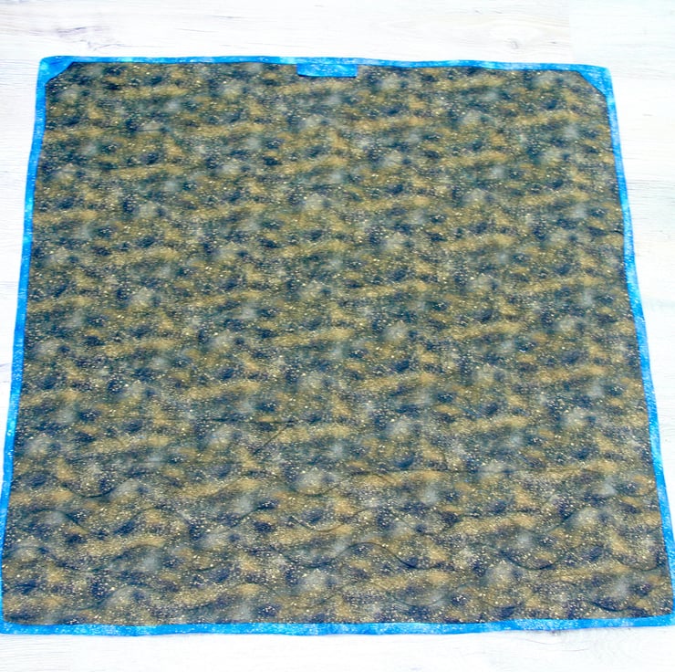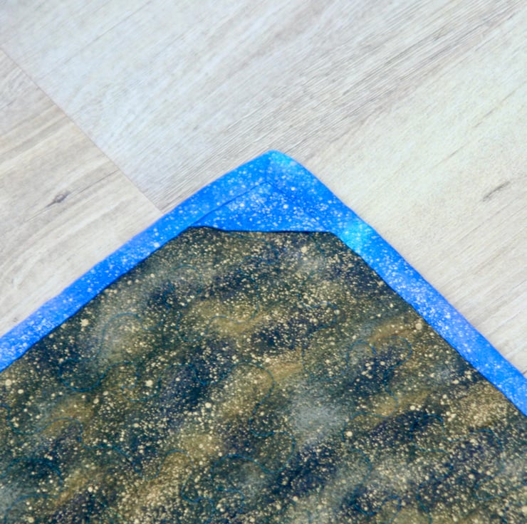 The backing fabric is dark green colour, also in a 100% cotton fabric and there is an eco-friendly polyester wadding between the layers of cotton made from recycled plastic bottles. The quilt is then bound with the blue fabric to match the sky. The binding is hand sewn to the back of the quilt to ensure a neat finish.