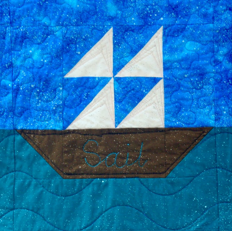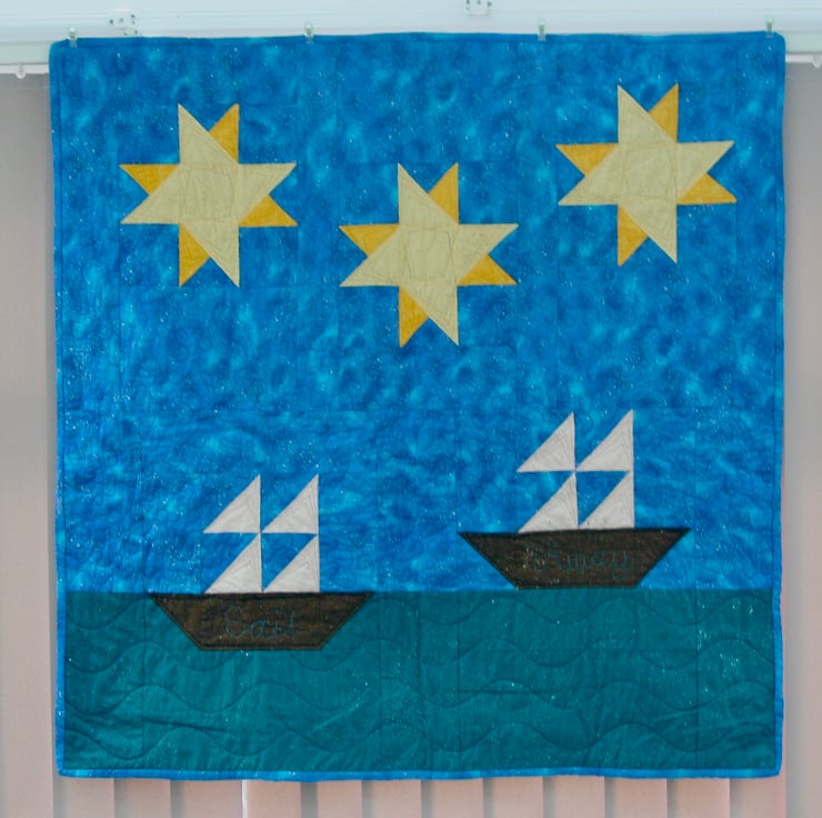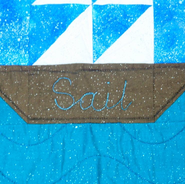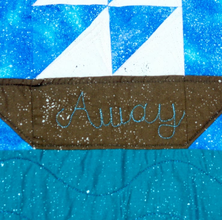 The quilt is approximately 35 inches (89cm) square and is made with 100% high quality quilting cotton. The front has two traditional patchwork sailboats on a teal coloured sea with 3 spinning stars in a dark blue sky. The boats are brown with very light pink sails. The stars are quilted using a straight line geometric design as are the sails of the boats. On the boats are the words 'Sail Away' and the sea is quilted with waves.