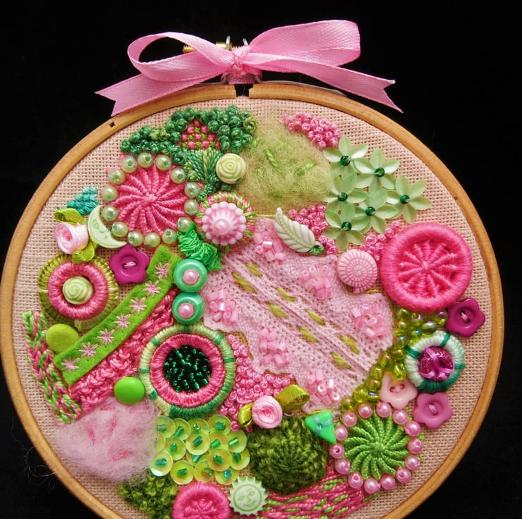 Mixed Media Collage in Embroidery Hoop in Pinks and Greens. A study in Pink and Green using lace, buttons beads etc. 5" embroidery hoop used. The back has a layer of wadding, then a circle of thin board and then a layer of felt and makes the piece nice and sturdy. There is a hoop attached to the felt for hanging purposes. A small bow at the top but this can be removed if not needed.