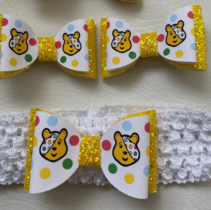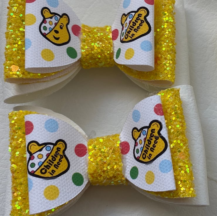 Handmade glitter bows and baby bands. Yellow glitter bows with my own printed canvas.