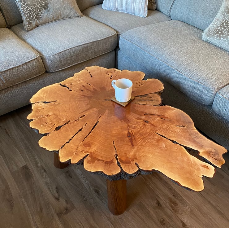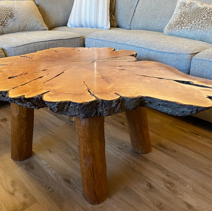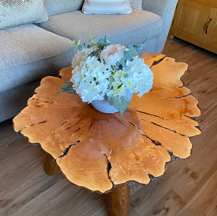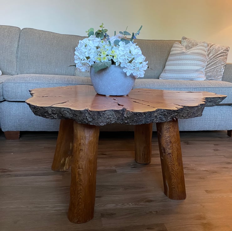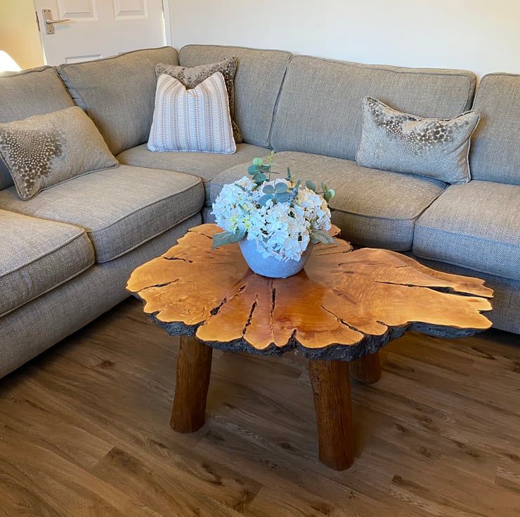 We wanted to make a larger coffee table for those that want something a bit bigger than the standard size. We wanted it to be different to the standard rectangular straight edged shape that is so commonly used in larger tables. We finally found this fantastic piece of yew which had all of the original markings from the tree as well as the stunning natural bark around the entire log slice! We knew to do the table top justice we had to make the legs as natural as possible, so we carved oak legs to match the overall natural aesthetic.