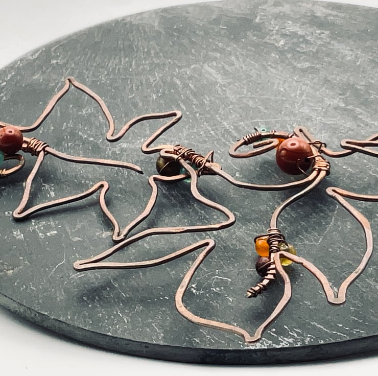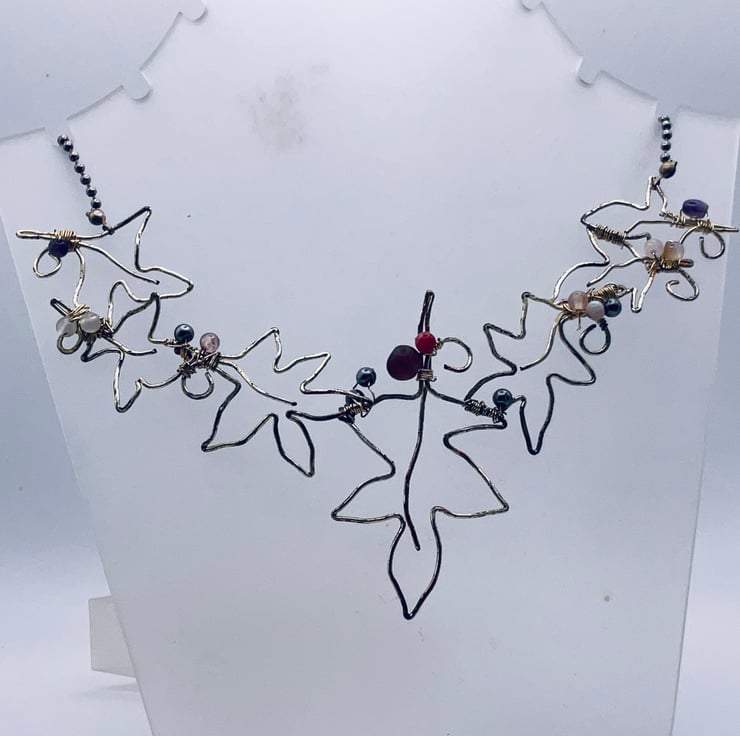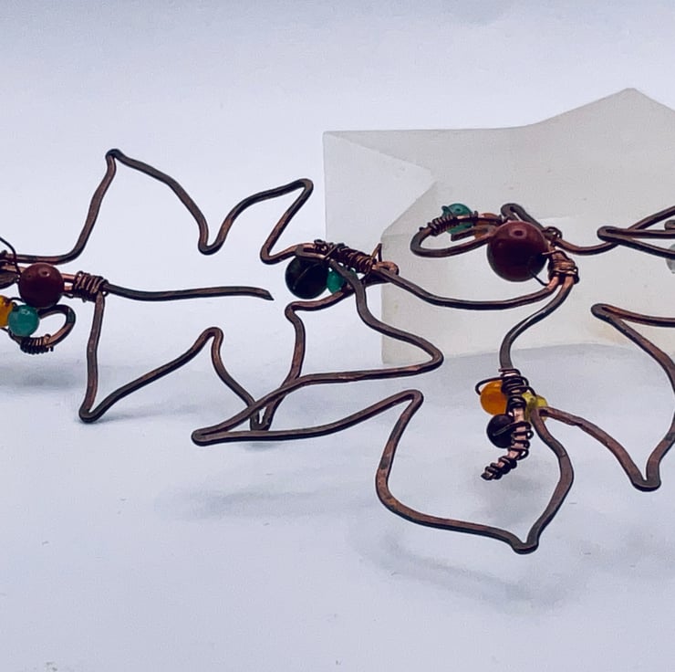 Greatly admired, this is an outstanding design. Perfect as a gift for someone who loves autumnal colours. This often the case for people with red or auburn hair though others favour it too! It is some 210 mm from side to side and the largest central leaf is 80 mm in depth. Wonderful as an autumn gift, buy it before it is too late! It is finished with copper bobble chain and a ring and bar clasp. It is 640 mm lomg.