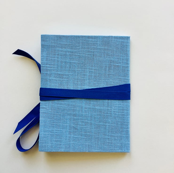 The journal is tied with hand stitched grosgrain ribbon tie.