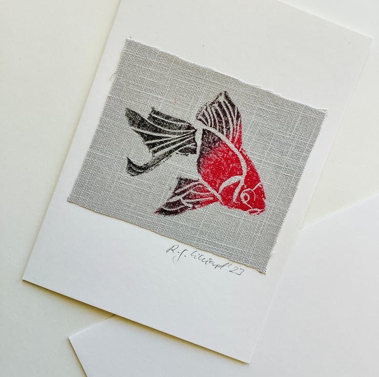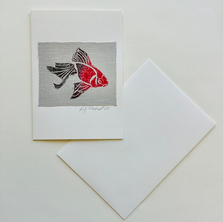 Lovingly designed greeting card that features beautifully hand block printed Koi Fish inspired by nature, hand carved into lino block and then hand printed on natural Eco-friendly 100% linen. The print on linen fabric is then placed onto 100% recycled acid free paper. It is blank inside and perfect for writing that special message. It comes with a white recycled envelope.