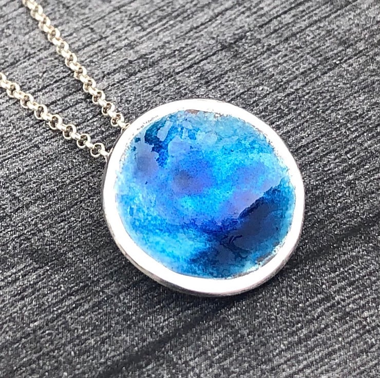 This enamel pendant was inspired by Mediterranean oceans. This simple but beautiful cup shaped pendant is like looking into the deep blue. I’ve used beautiful transparent blue enamels which allows you to see the texture beneath.