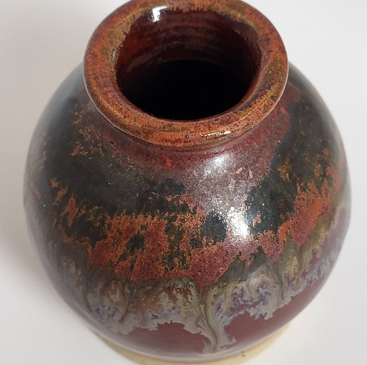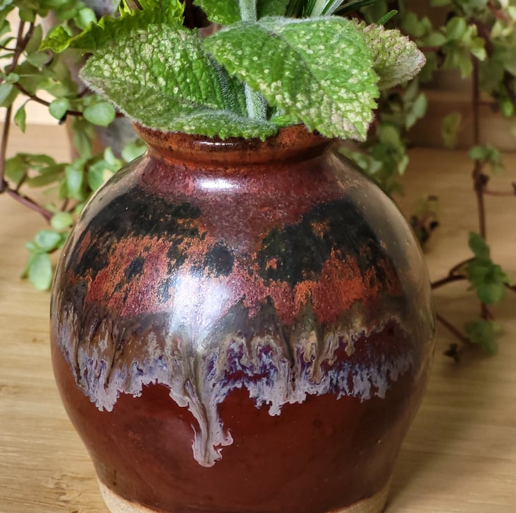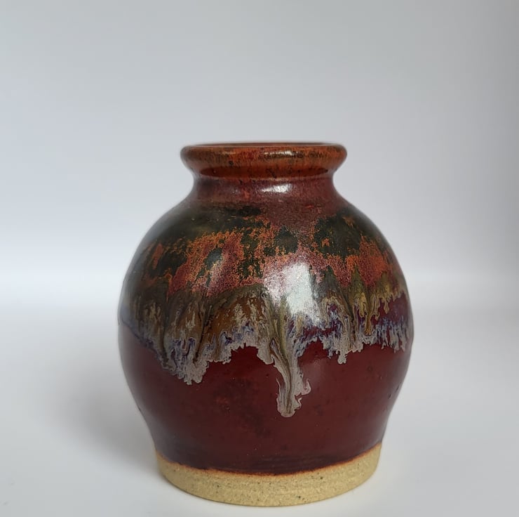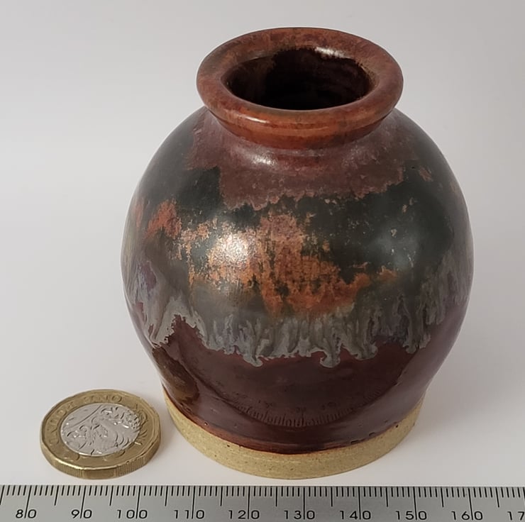 Decorated in a copper and red glaze, this lovely little vase has a narrower neck with a plump little body.The red glaze is glossy whilst the copper glaze has slightly less gloss of finish and almost an aged patina look. Made out of a buff stoneware clay, it is approximately 7.5cm tall, 6cm diameter and the neck opening is approximately 2.5cm wide.
