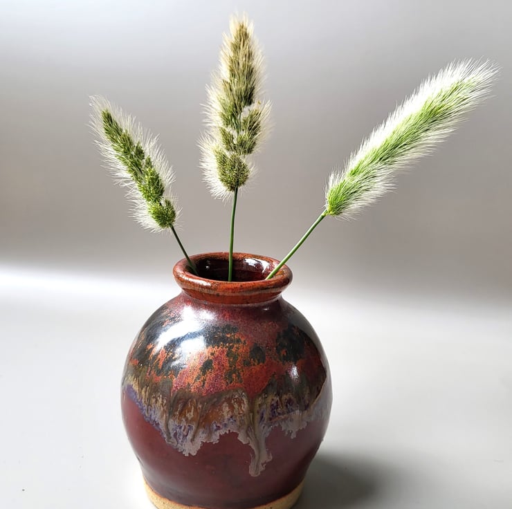 I struggle to find vases for tiny flowers so I made this. It's been wheel thrown and is perfect for showcasing a posy of small or short-stemmed flowers from the garden like old varieties of sweet-pea. I'm trying a new copper coloured glaze instead of my usual blues and greens, which works beautifully alongside the red.