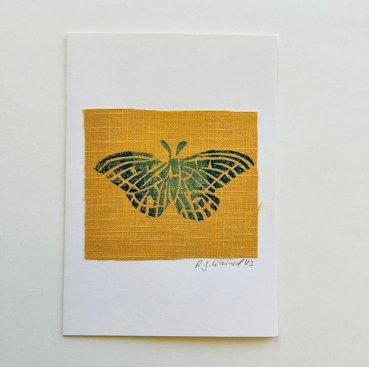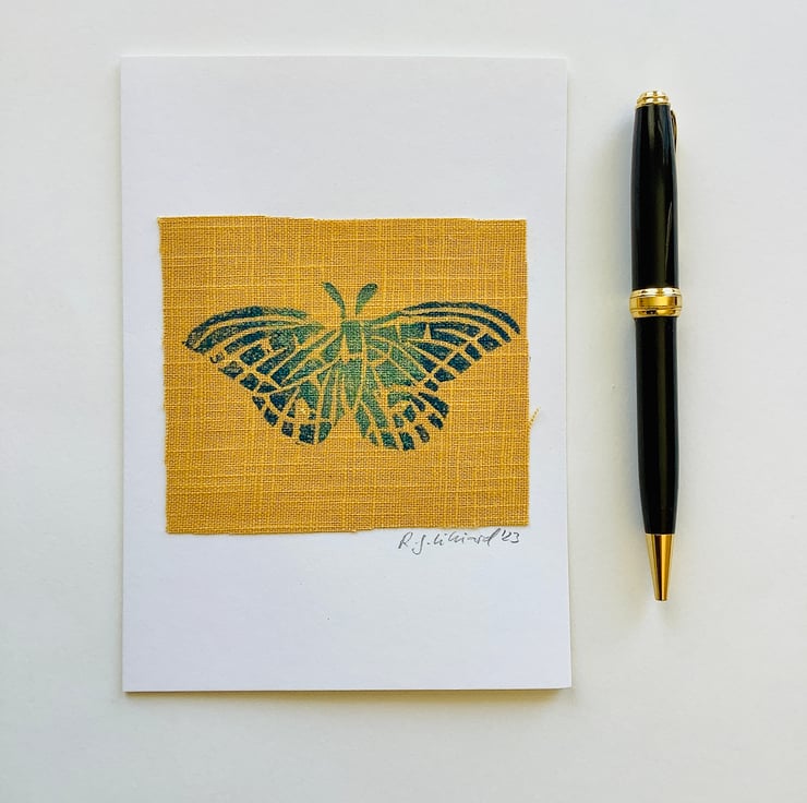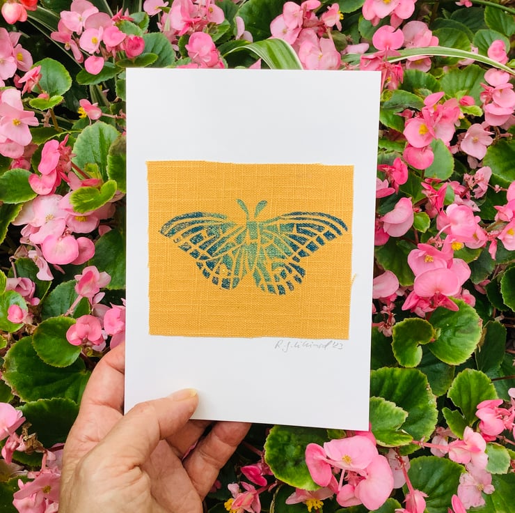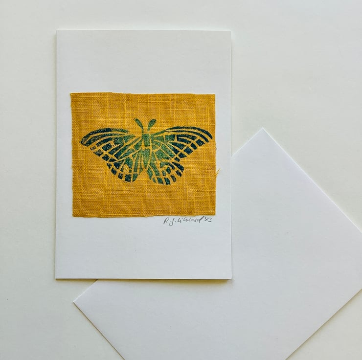 Lovingly designed greeting card that features beautifully hand block printed Butterfly inspired by nature, hand carved into lino block and then hand printed on natural Eco-friendly 100% linen. The print on linen fabric is then placed onto 100% recycled acid free paper. It is blank inside and perfect for writing that special message. It comes with a white recycled envelope.