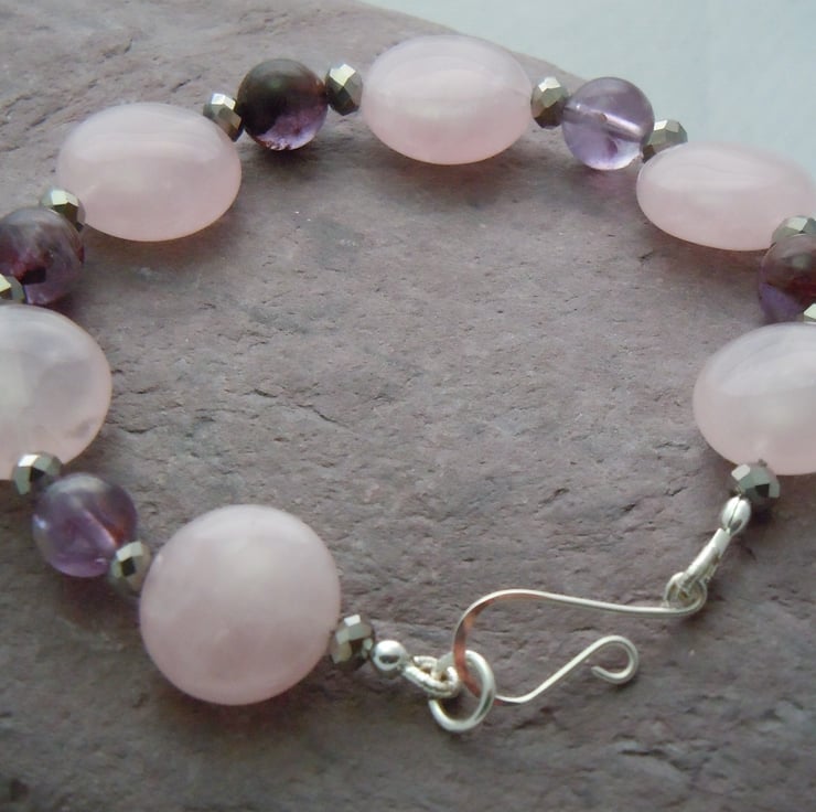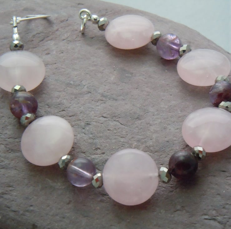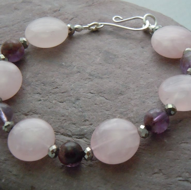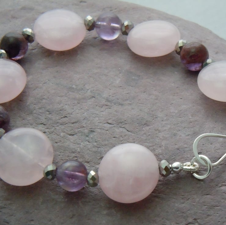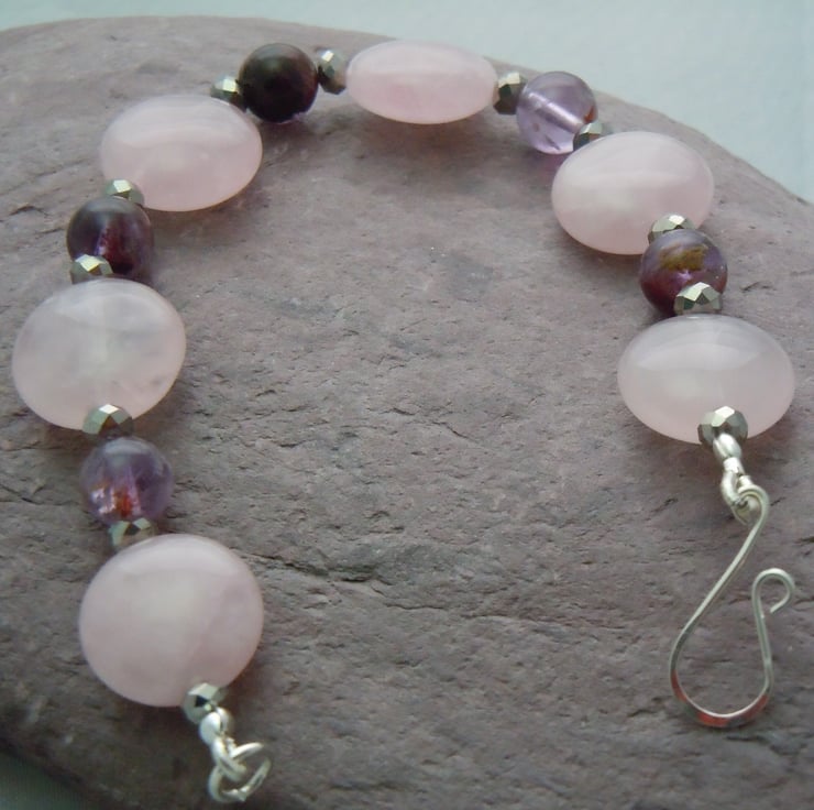 A bracelet with gorgeous pink Rose Quartz coin beads with purple rutilated quartz round beads & faceted Czech glass spacer beads finished with a handmade Sterling silver clasp & fittings.