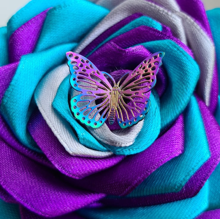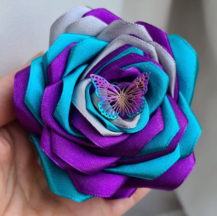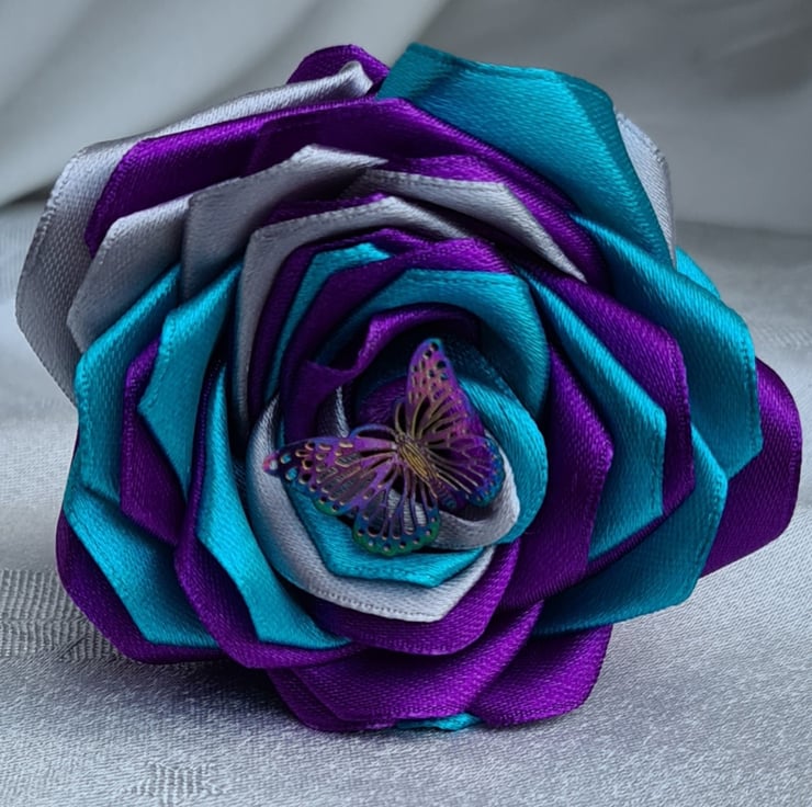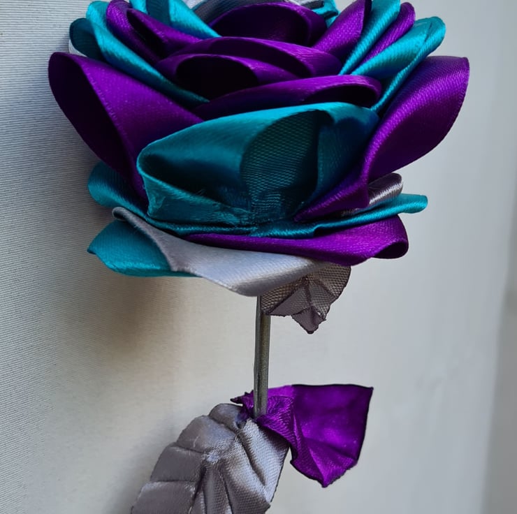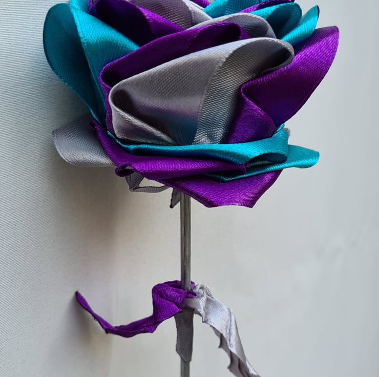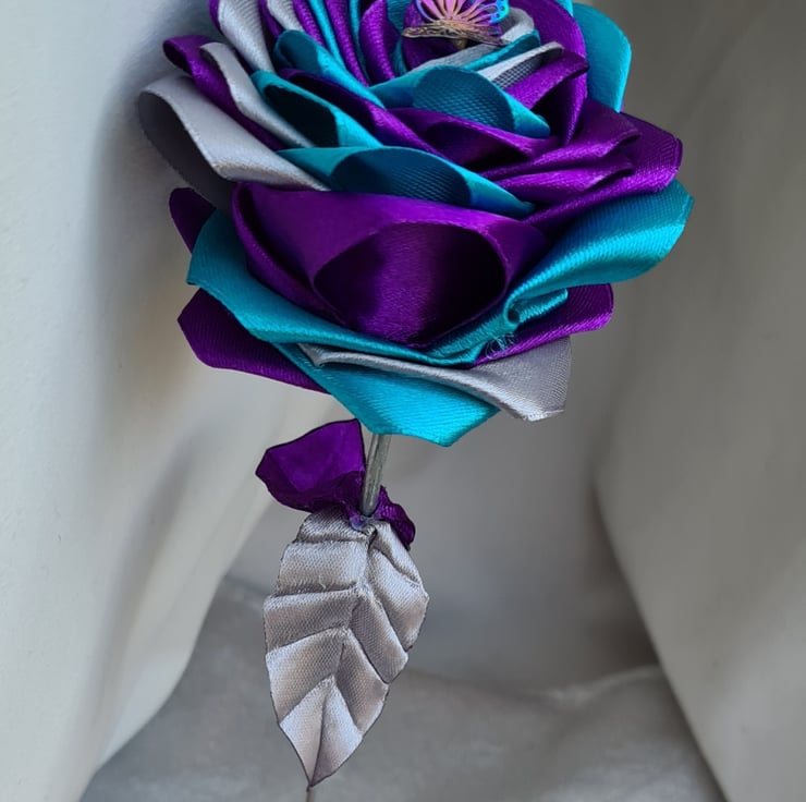 A beautiful handmade single stem rose (one flower only), made with petals in gorgeous Purple, Silver and Turquoise ribbon with a Butterfly charm at its centre. This faux flower is so lovely, and would make a wonderful and unusual keepsake gift.The stem is made from bamboo (Non-bendy) and painted Silver and the leaves are made from purple and Silver Satin ribbon.