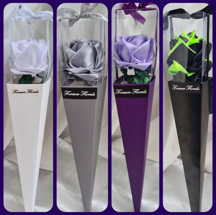 Pic 1 shows a collage of photos of the Rose from different angles. Pic 9 shows the Rose Cone Gift Box colours (Roses shown in pic 9 is for illustration purposes only and are NOT included).