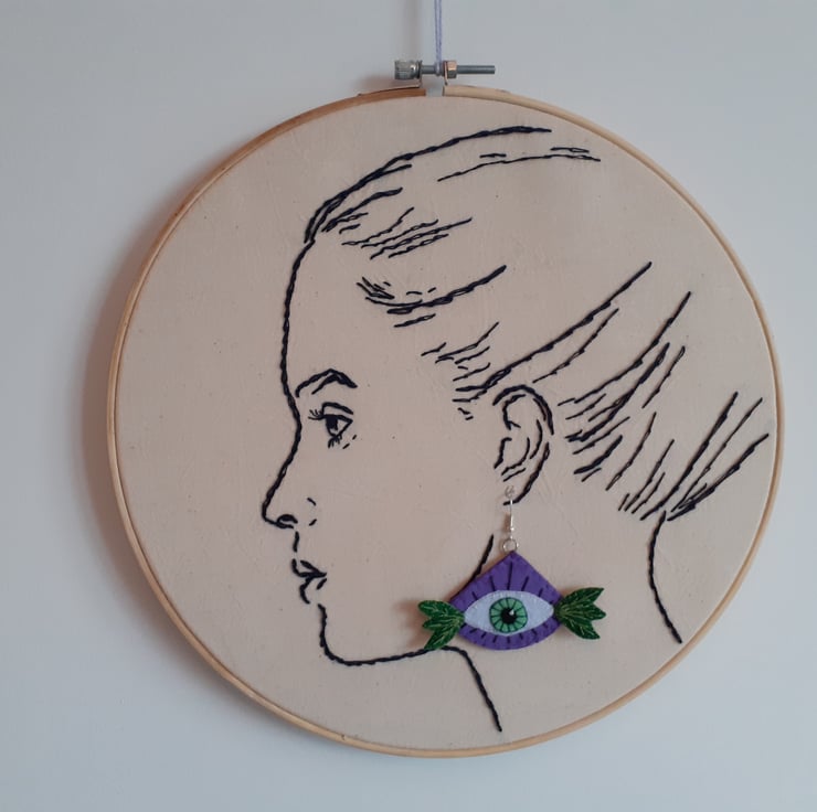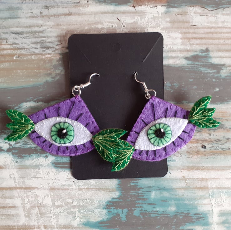 Eye and Leaf Motif on felt Earrings with hand embroidery details. Stainless Steel ear hooks.
