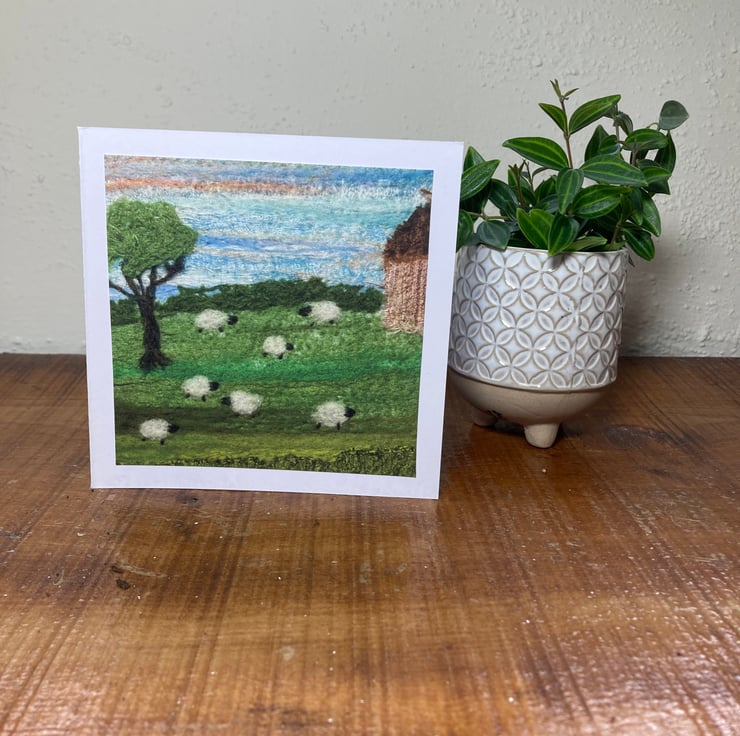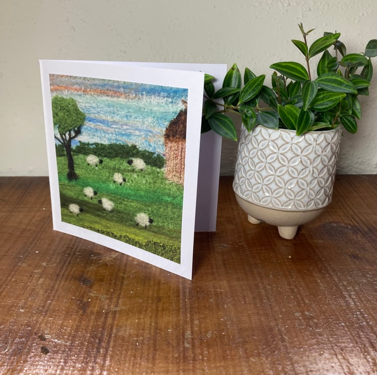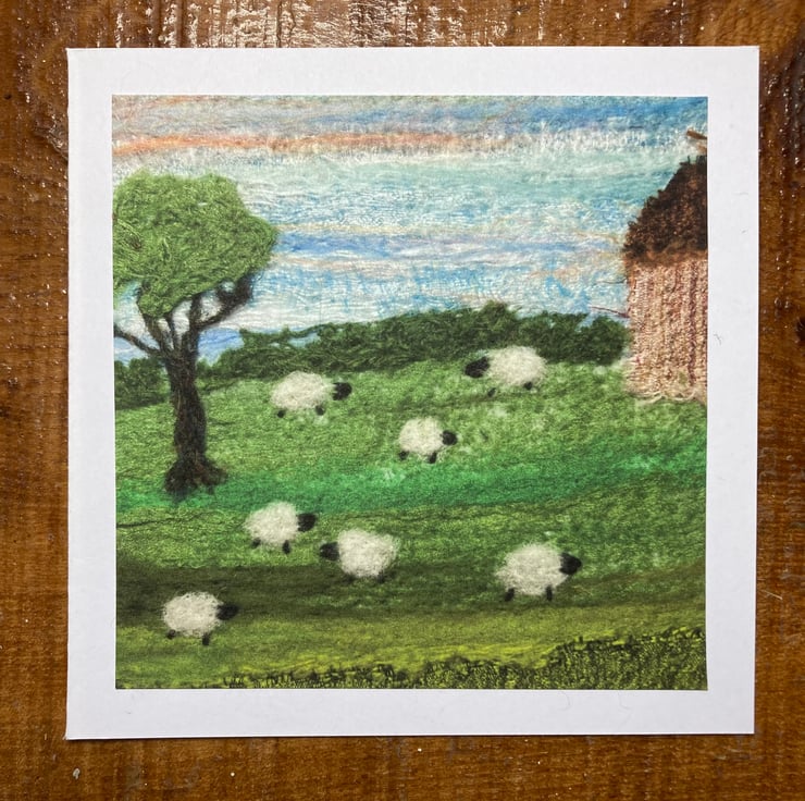 This greetings card has been made using a print of a piece of my original textile art. The image on this card is of sheep grazing on a hillside outside a barn. The original artwork is formed using silk fabric and wool fibres needle felted to create the picture. The image has been printed on white cartridge paper and mounted onto a 5"x5" white card. The card has been left blank inside for your own message and comes complete with a white envelope.