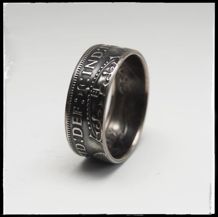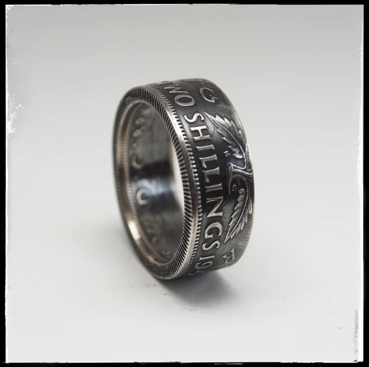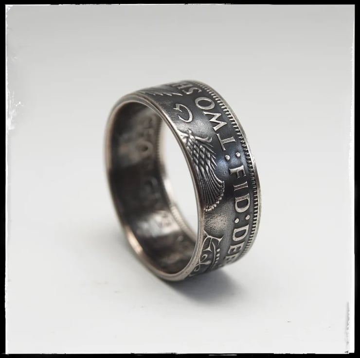 Here we have some awesome hand crafted coin rings made using the .500 or 50% silver two shilling. Just look at the detail on these. The coins I use are hand picked so I can get the best ones with minimal wear, that way I can be sure of making some of the best available. These have had a patina added that will eventually wear leaving a more natural finish.