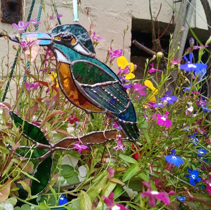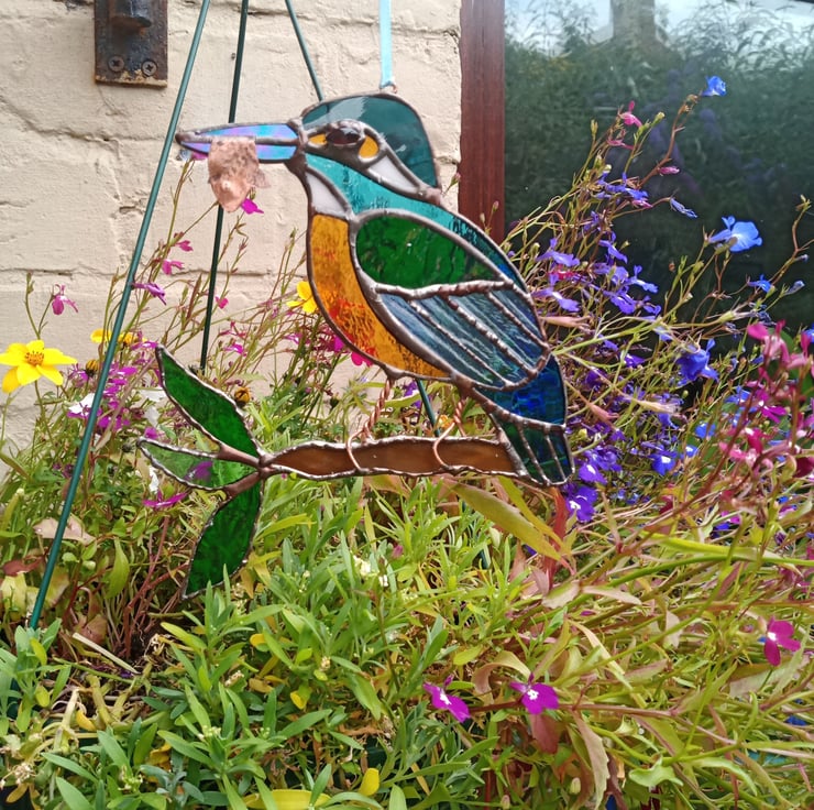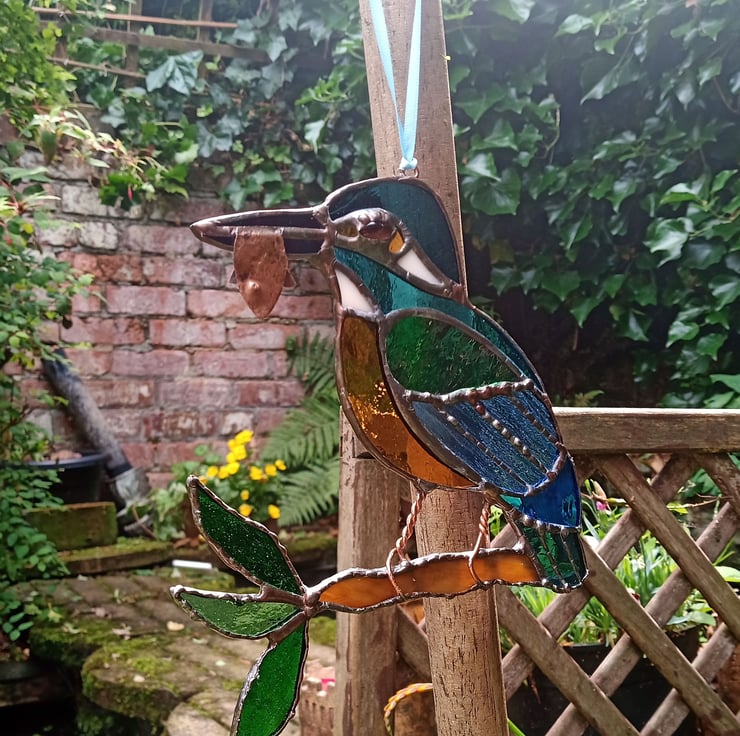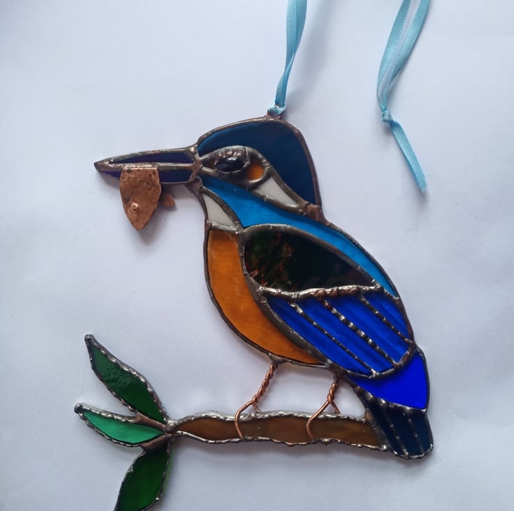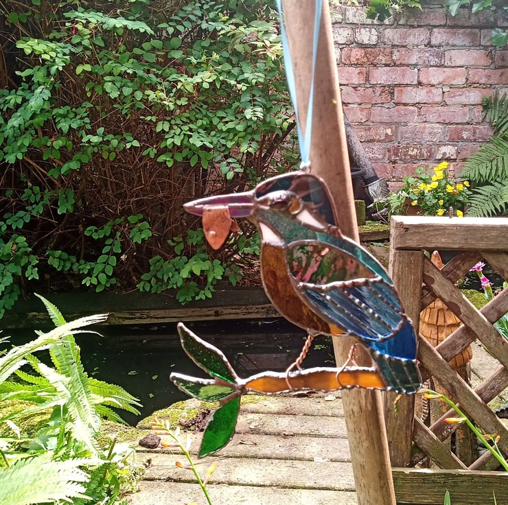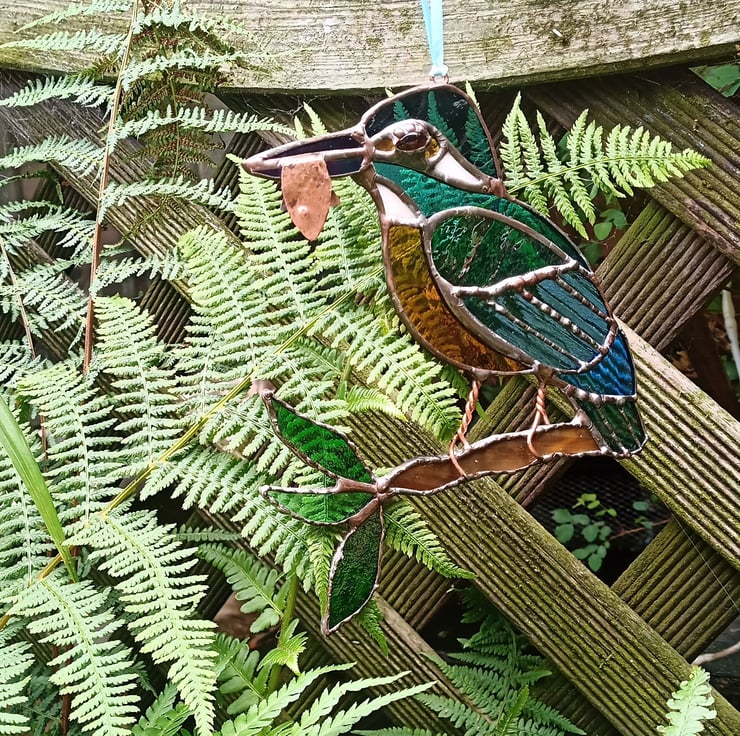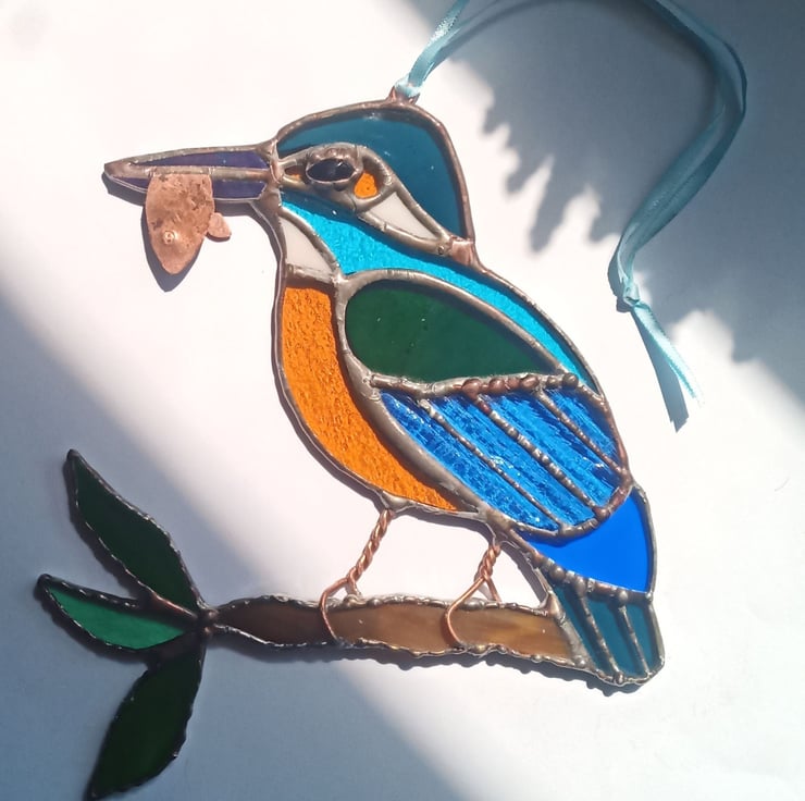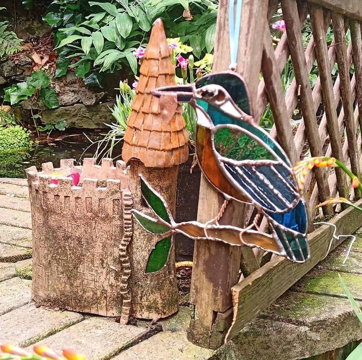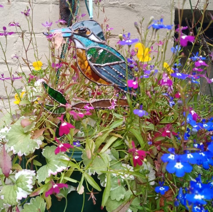 A beautiful kingfisher created using a mixture of textured and iridescent blue, orange, white, brown and green glass with twisted copper wire legs and a copper foil fish in his beak. Looks great hanging in the garden, in a window or on a wall near a lamp or uplighter to bring a touch of nature indoors. The perfect gift for bird lovers, gardeners or anglers.