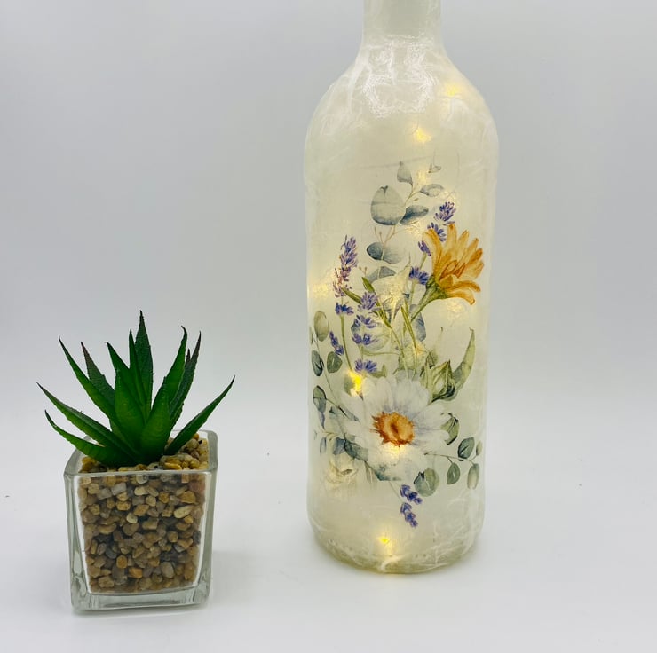This decoupage bottle with LED lights, is decorated with a delicate daisy and eucalyptus floral design. Handcrafted with love, this unique piece brings a touch of nature's beauty into your home. When lit, the LED lights create a mesmerizing glow, casting a warm and enchanting ambiance.