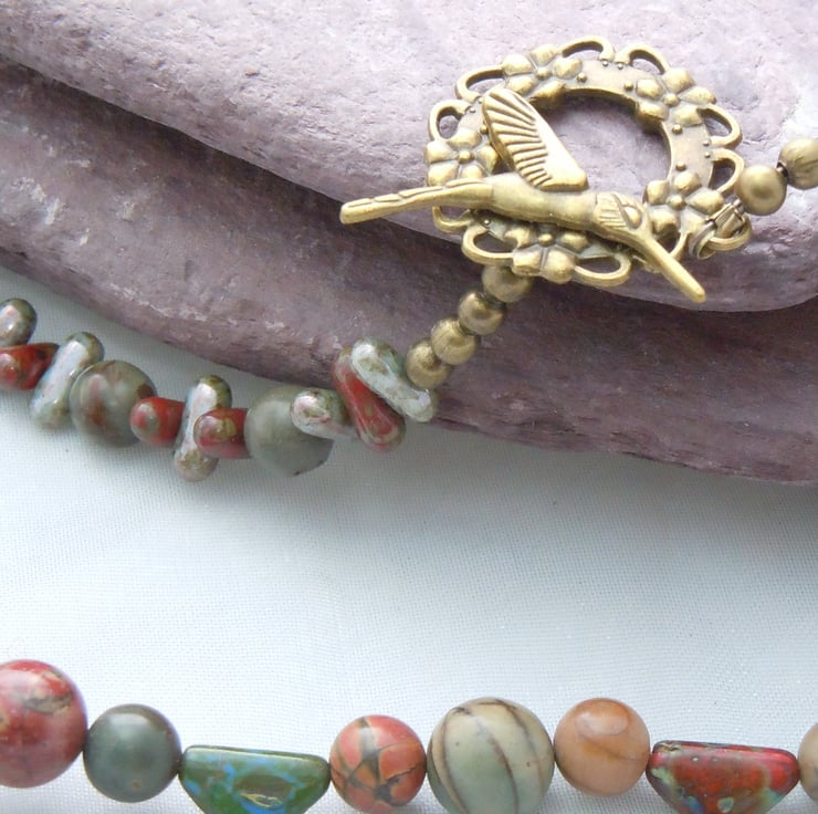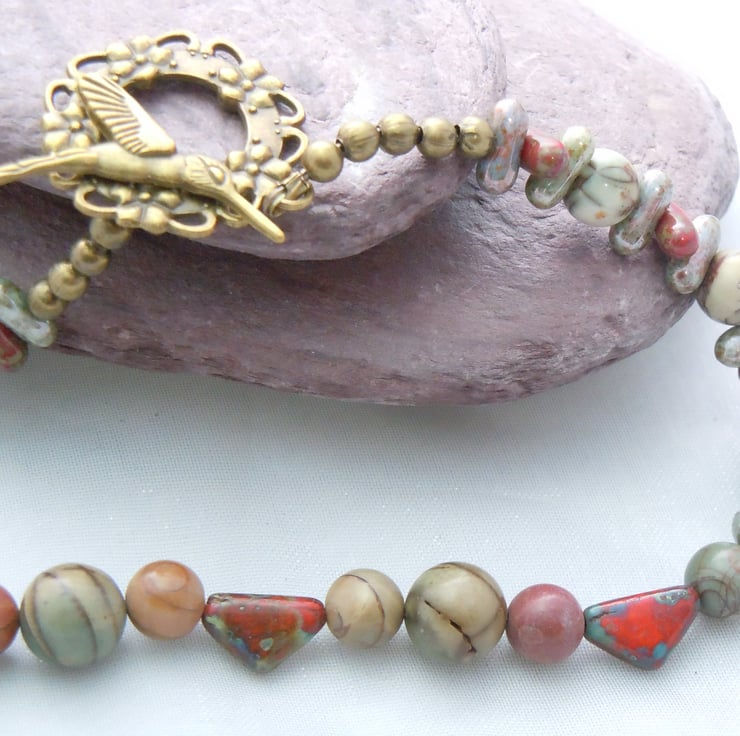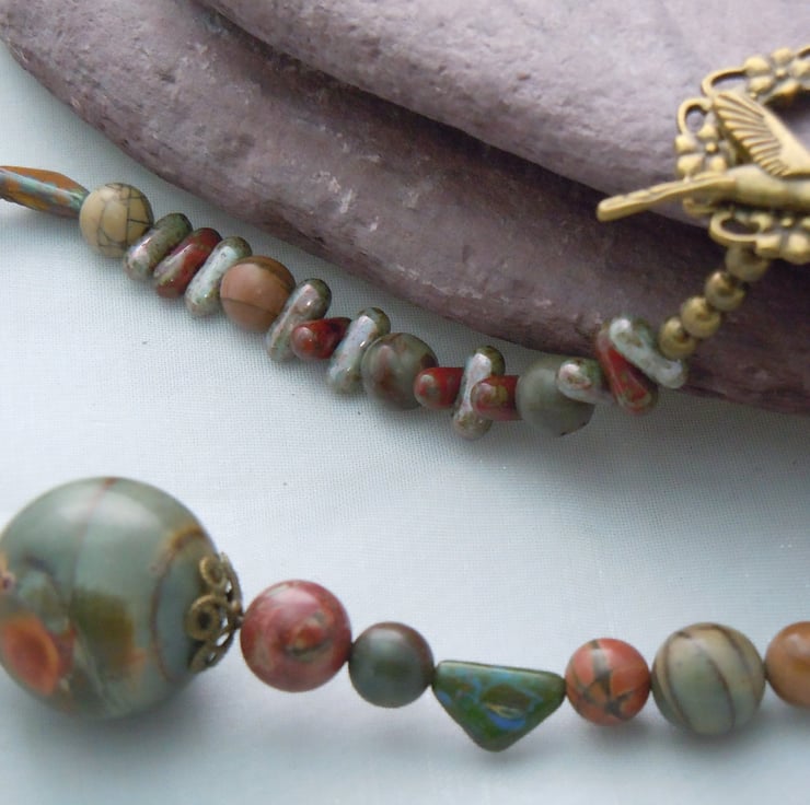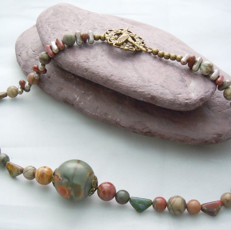 A statement necklace of various picture Jasper beads in stunning rustic colours with 2cm focus bead, Czech glass peanut shape beads & tribal rustic Picasso triangular beads in toning earthy colours. All the fittings & decorative humming bird toggle clasp are antique bronze.