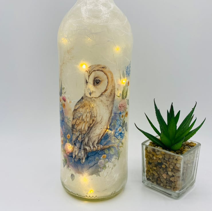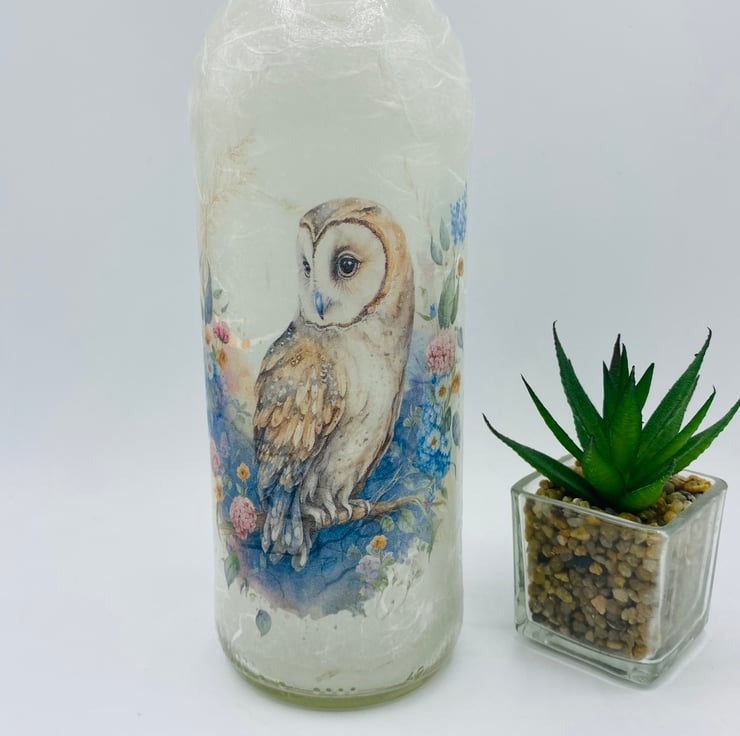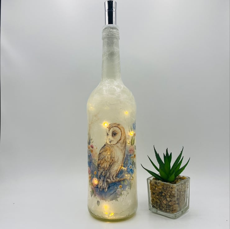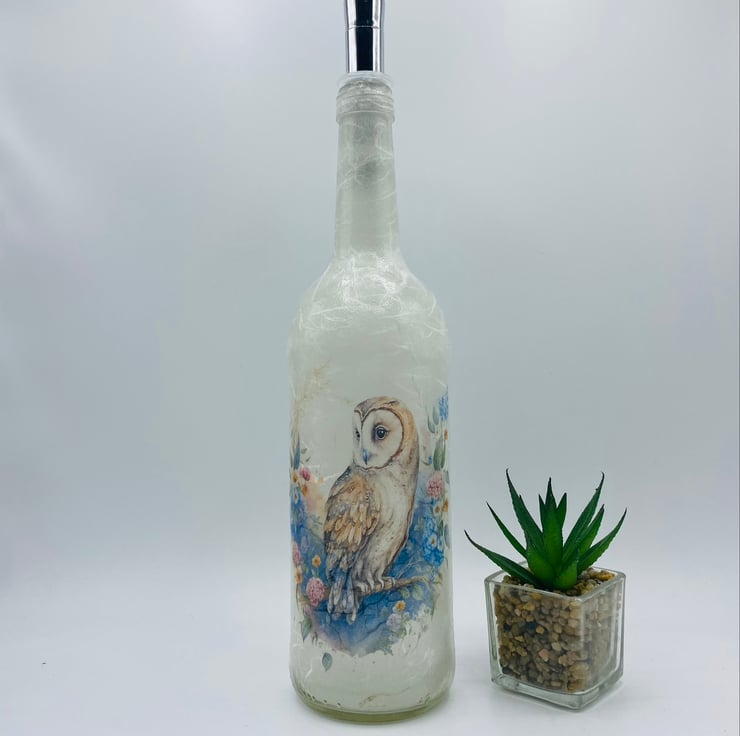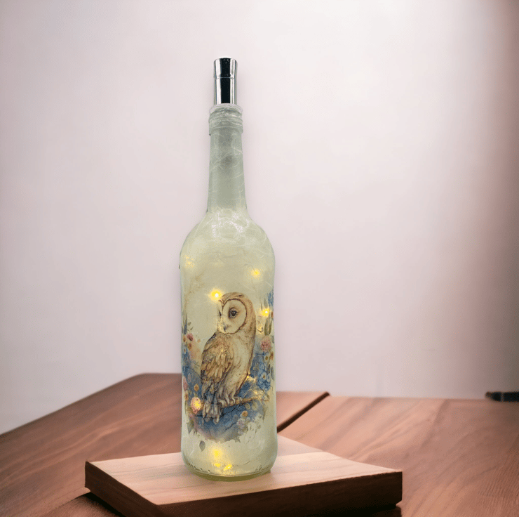Introducing our stunning decoupage bottle with LED lights, featuring a charming owl design with a delicate floral background. This unique bottle will add a touch of magic and elegance to any space. The intricately designed owl, adorned with dainty watercoloured flowers, will mesmerize you with its beauty. With the flick of a switch, the gentle LED lights nestled inside the bottle will cast a warm and inviting glow, creating a cozy ambiance in your home. Whether it's placed on a shelf, used as a centerpiece, or gifted to a special someone, this decoupage bottle is sure to be a delightful addition to any owl or nature lover's collection.