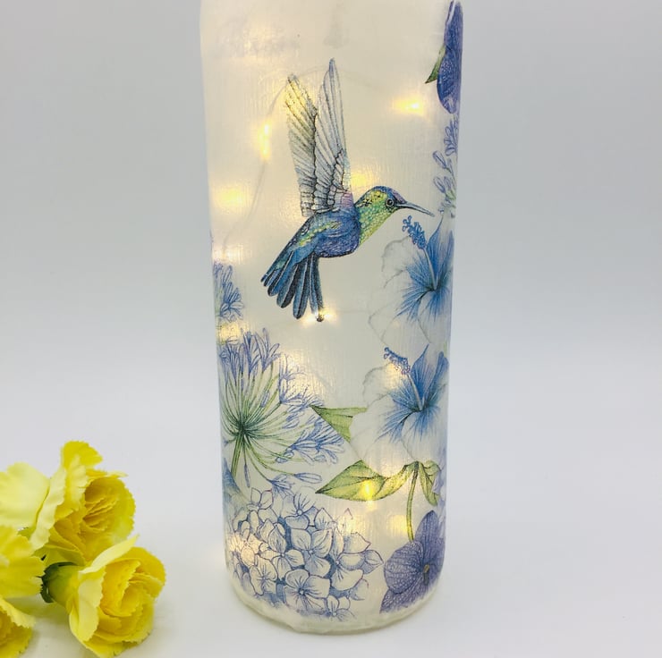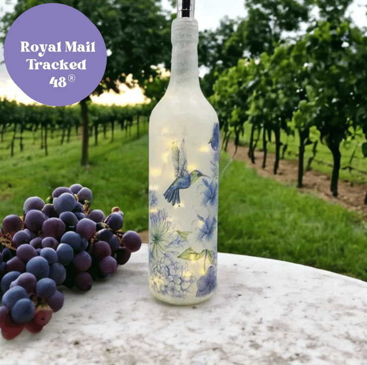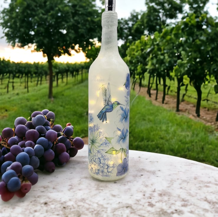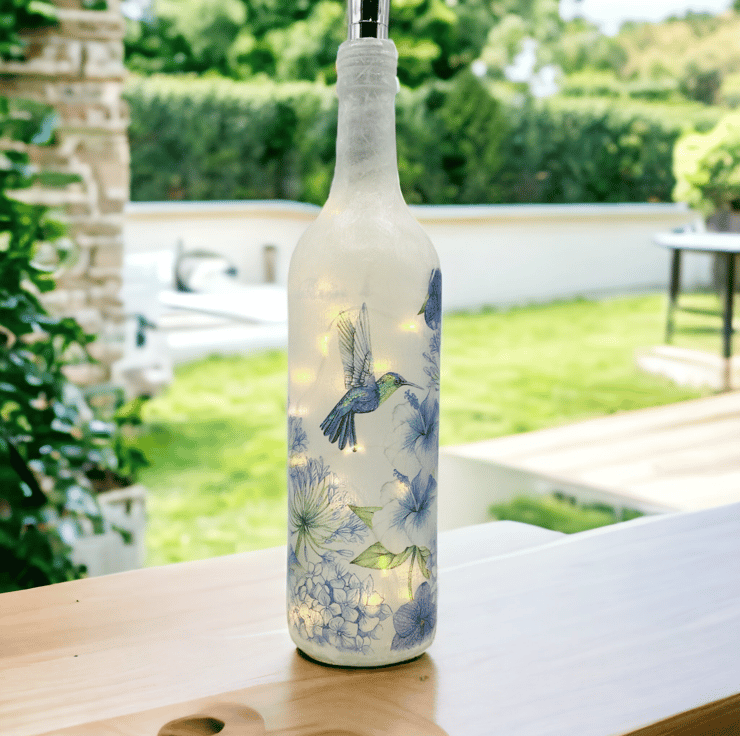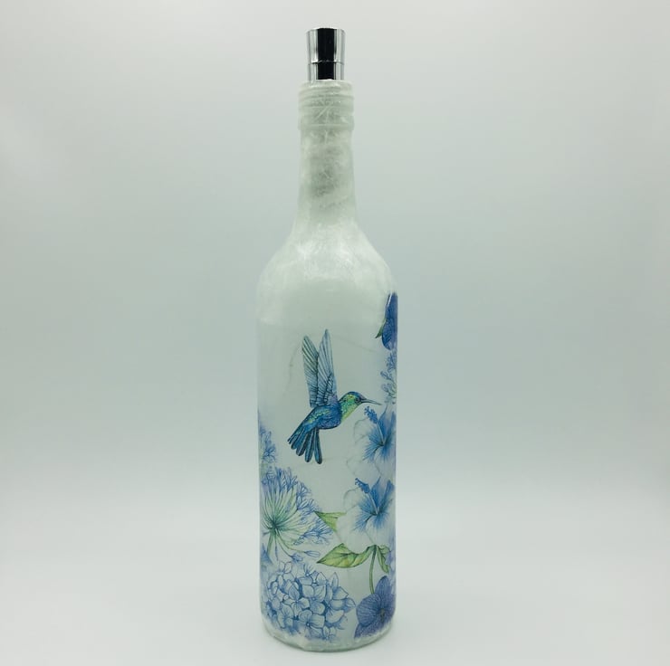 Beautifully decorated wine bottle, decoupaged with mulberry paper and a paper napkin featuring a beautiful hummingbird.