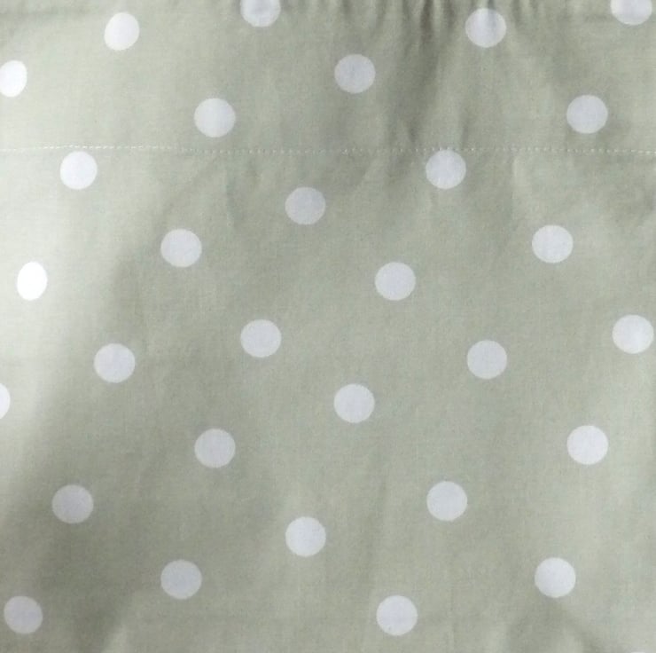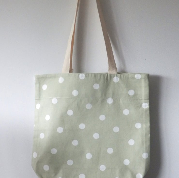A tote bag made from a fabric that is most probably cotton, with a design of cream spots on a green background. The source and exact composition of the fabric is unknown, as it was obtained as a remnant.