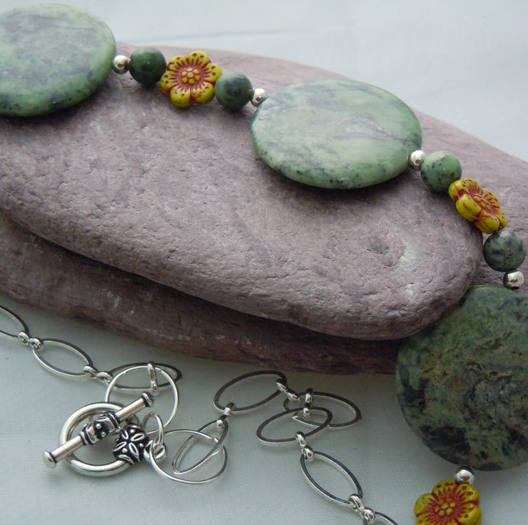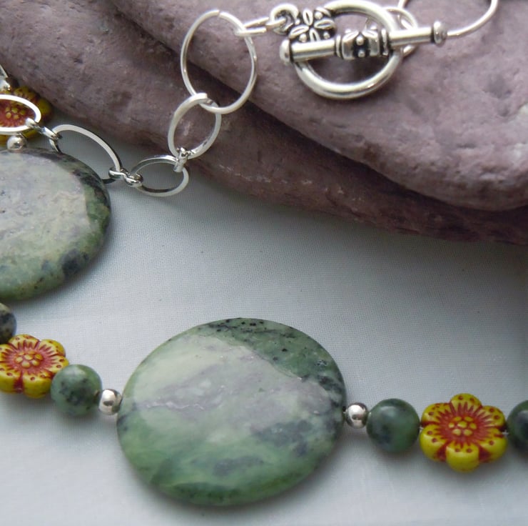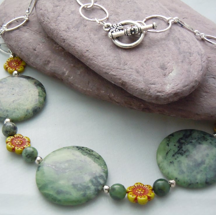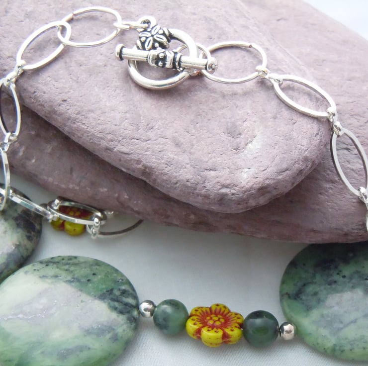A statement necklace with 3 large green Jade coin beads & lime green/cerise Czech glass flower beads. The 3 large Jade beads are 1.25" or 3.5cm & the smaller Jade beads are 5mm. The large link oval chain is silver plate including the decorative toggle clasp.