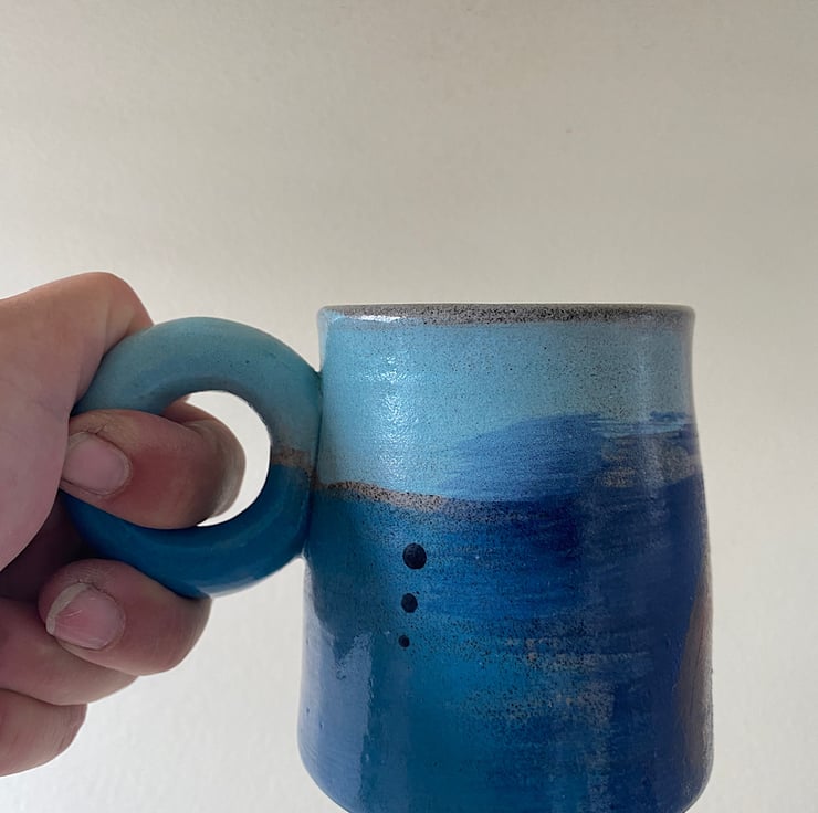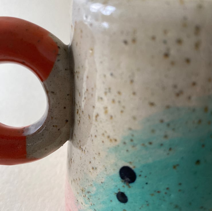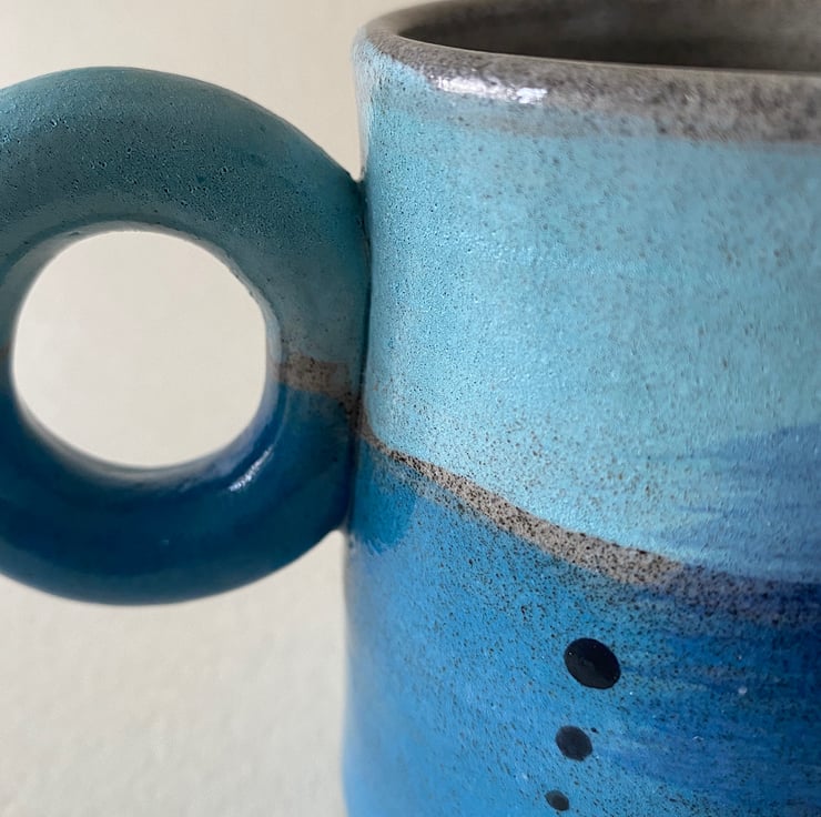The orange handled mug is made with a warm speckled stoneware clay. The blue donut handled mug is made with a grey speckled clay.