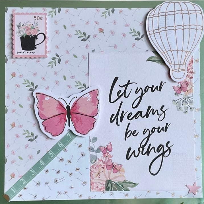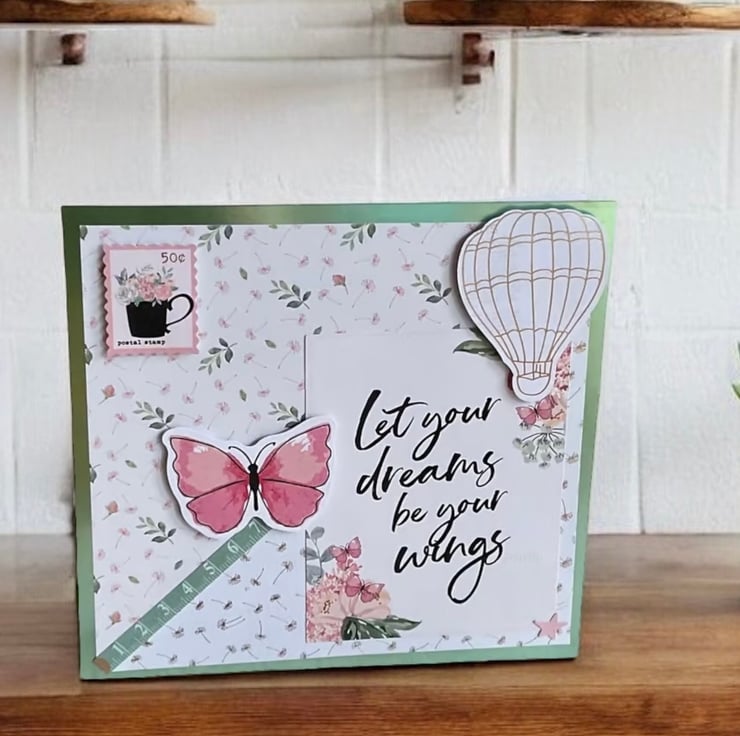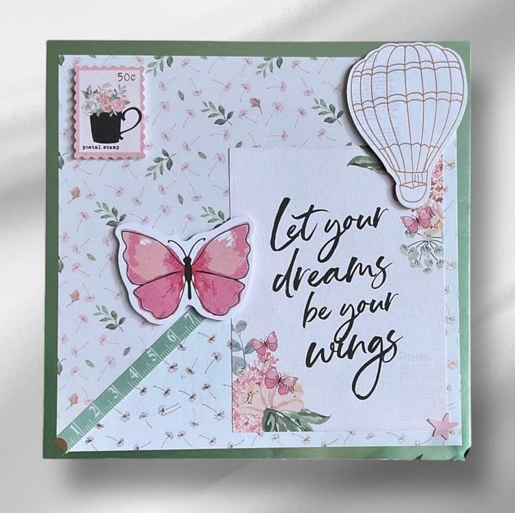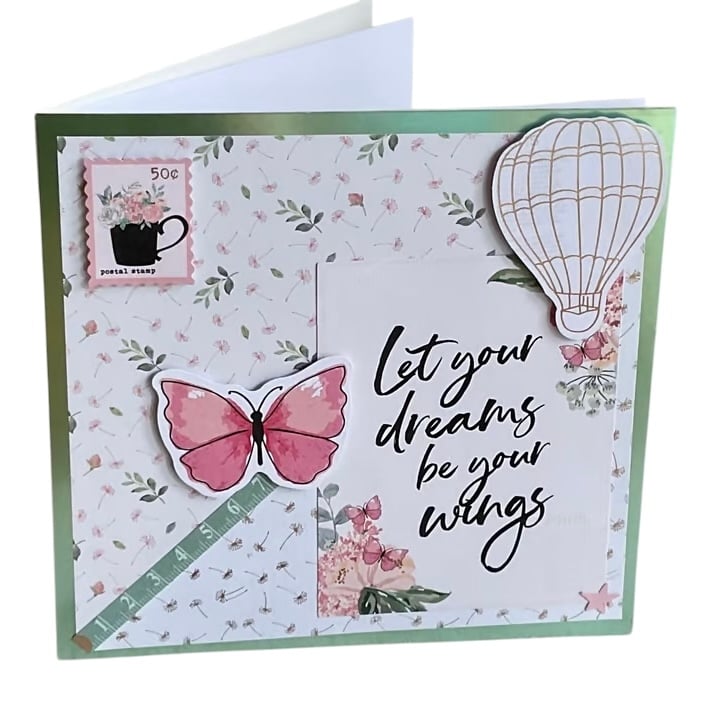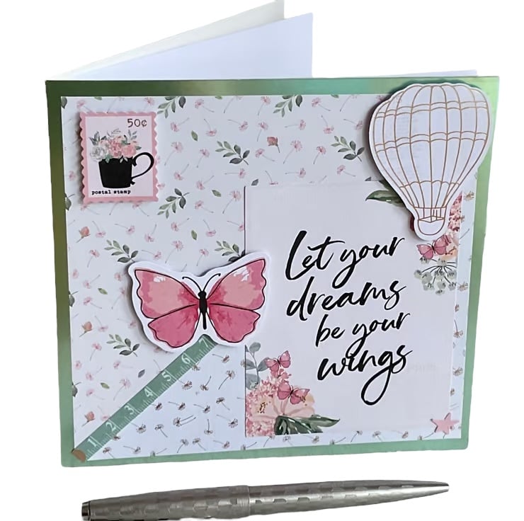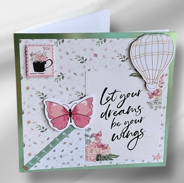 The sentiment Let your dreams be your wings feature on a card base with flowers and butterflies and a hot air balloon.