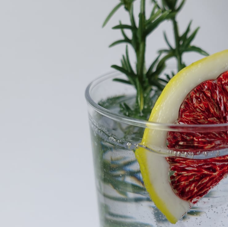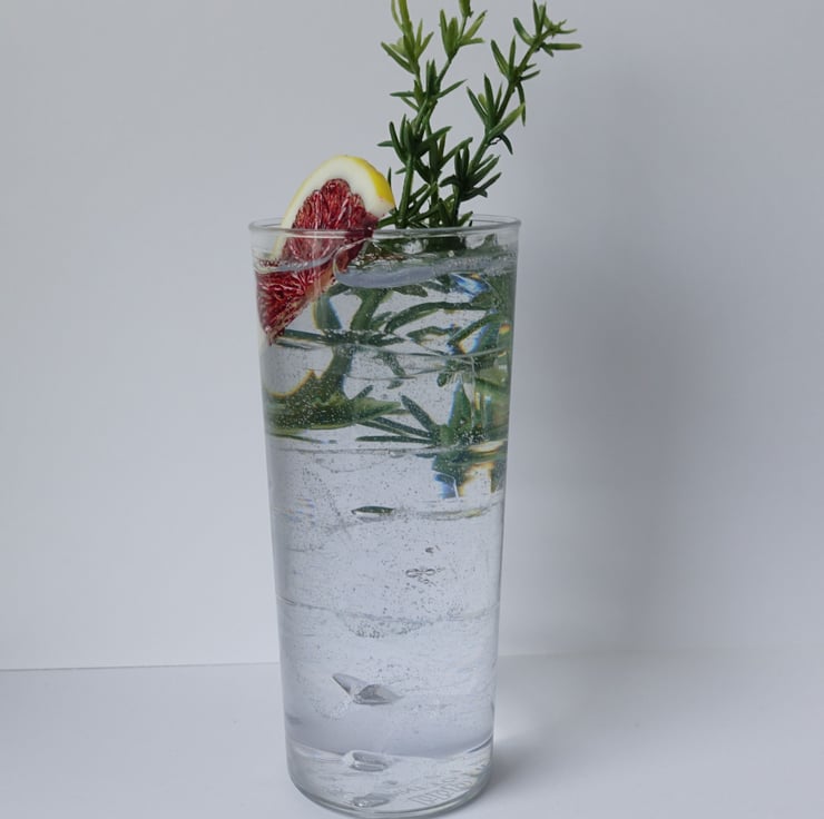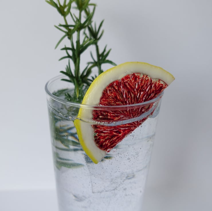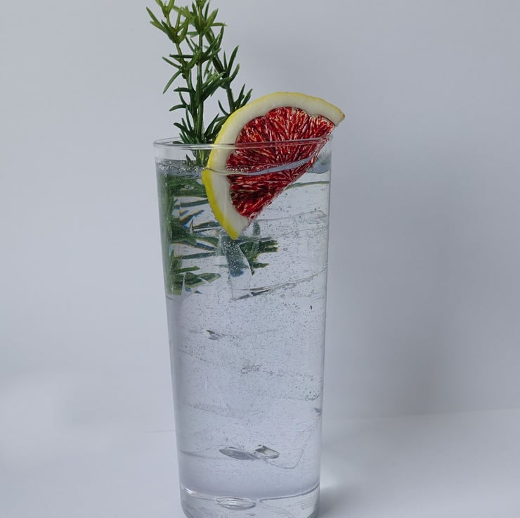 Highly realistic gin cocktail in a safety polycarbonate high ball glass with ice, pink grapefruit slice, sprigs of thyme.