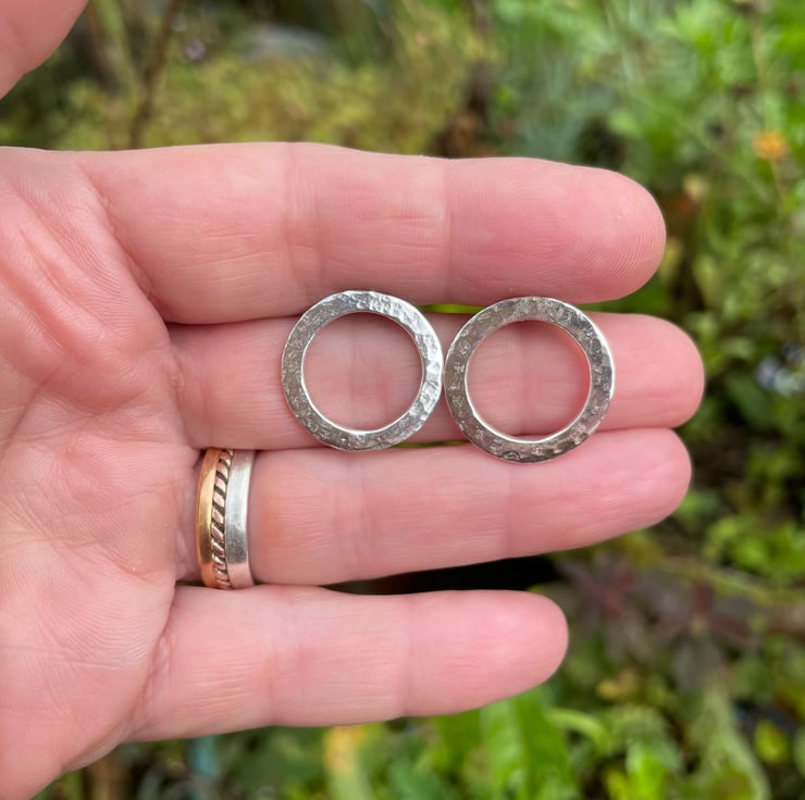 The earrings are quite substantial, they are 1.5mm thick and measure just over 2cm diameter. Sterling silver post and butterfly fittings.