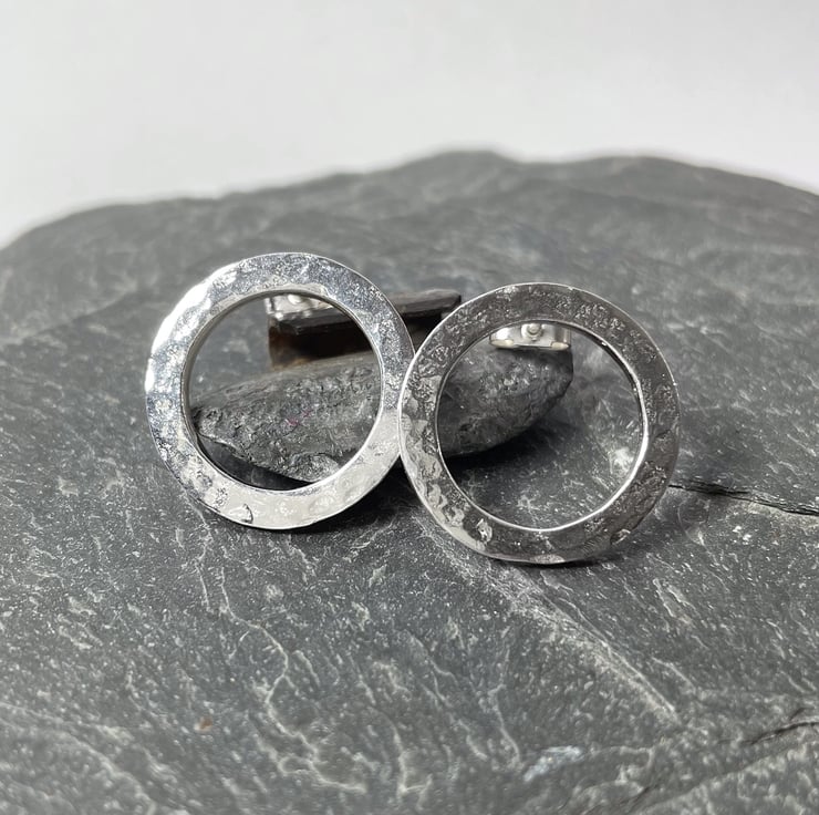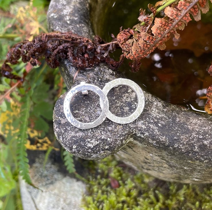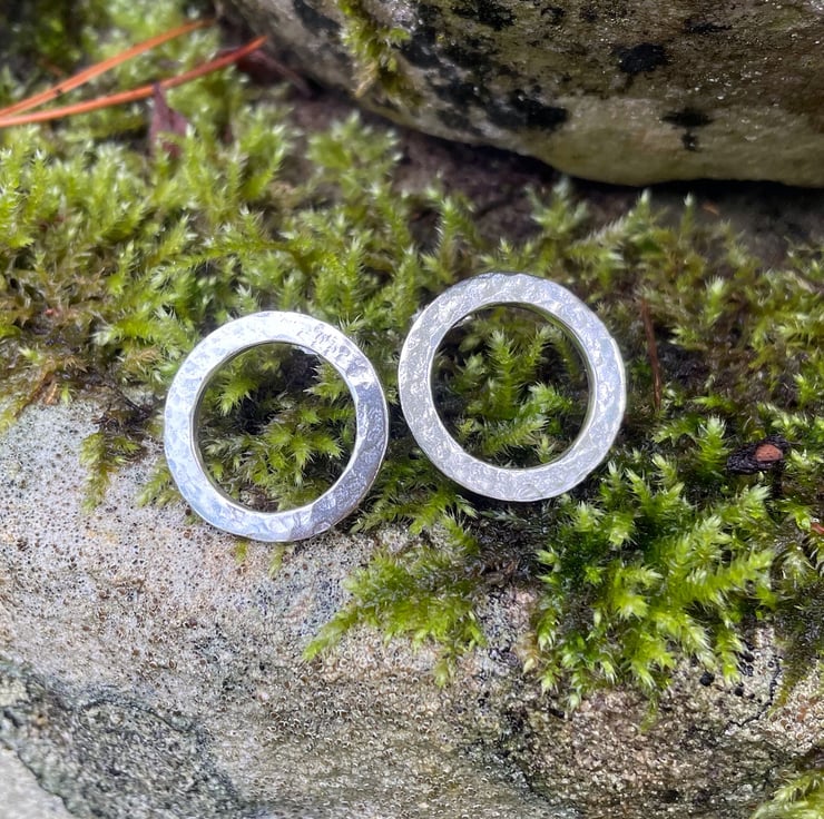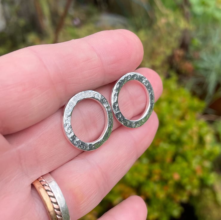 These circular stud earrings have been textured and planished with hammers, then polished to a high shine, they reflect the light beautifully.