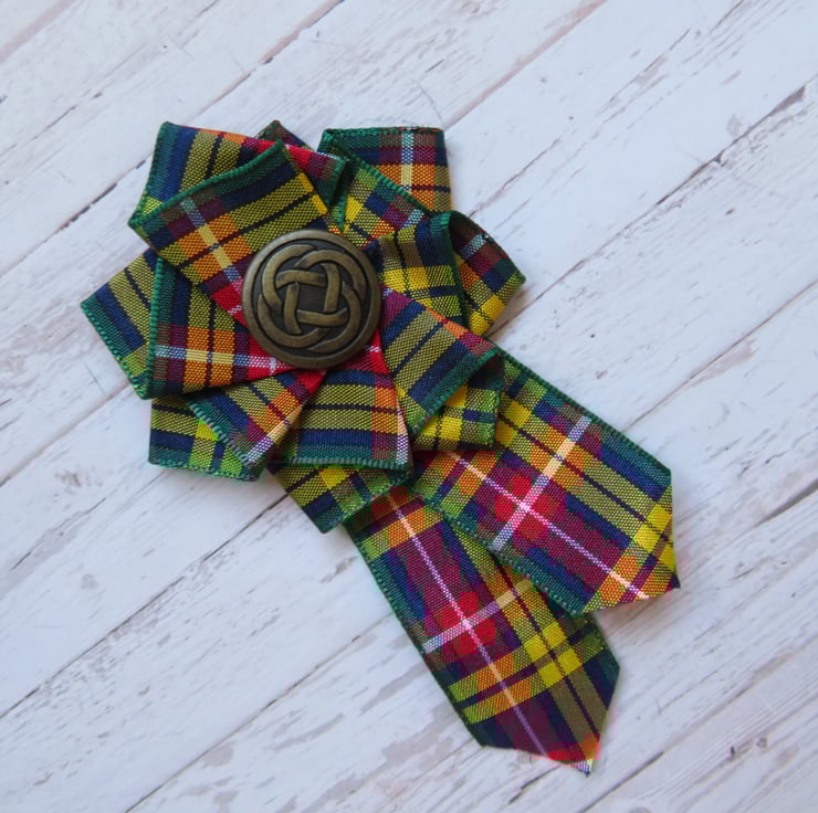 Made with a small circle of dark green felt with a small brooch pin attached and a handmade and sewn ruffle of Buchanan (Modern) tartan ribbon with wide ribbon shaped trails and finished with either a small round or oval red crystal or dark red pearl & rhinestone cabochon, silver or brass Celtic button or clusters of pearls, yellow with a coloured centre.