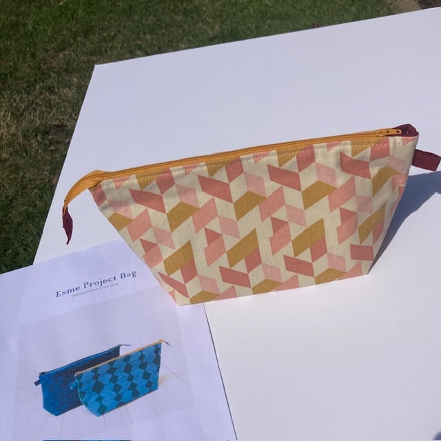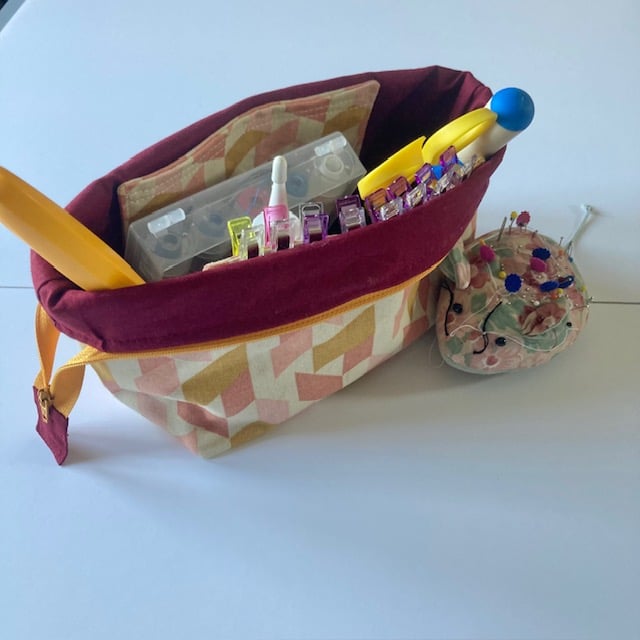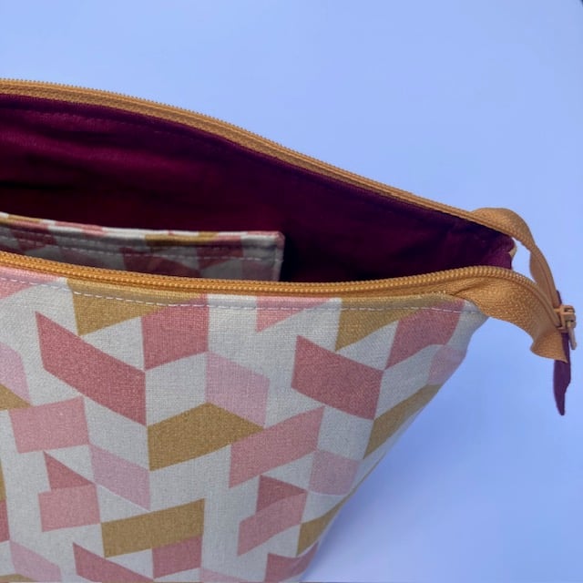 The outer fabric is a cotton canvas with a geometric diagonal block shapes designs in soft colours of pink, and ochre on a cream background. The lining is a burgundy colour and the zip is golden yellow.