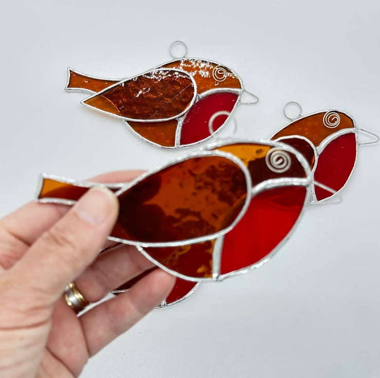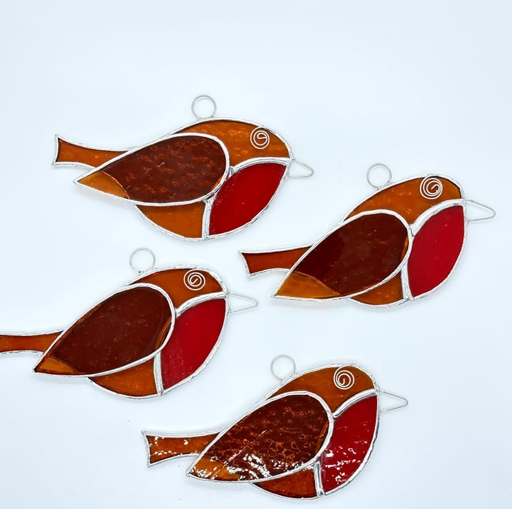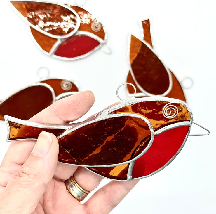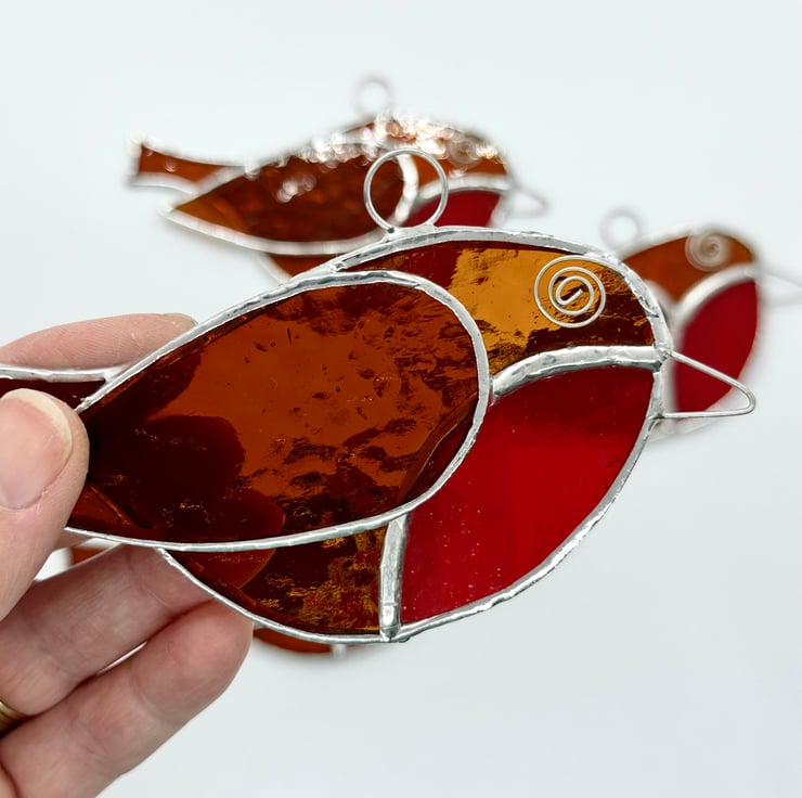 I have several of these little robins which have been made from an amber corella glass with a red sea glass for breast. Tinned wire has been used for the eye and beak.