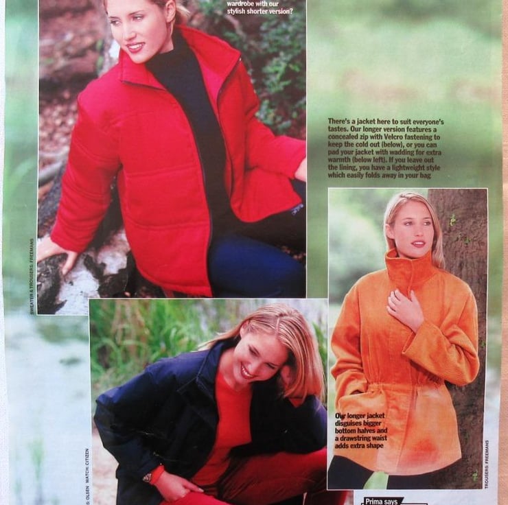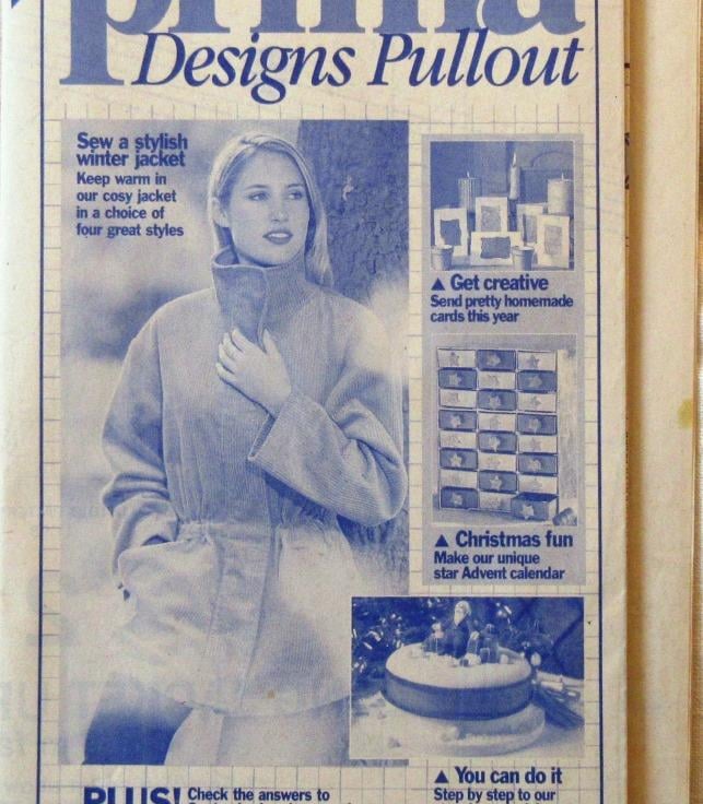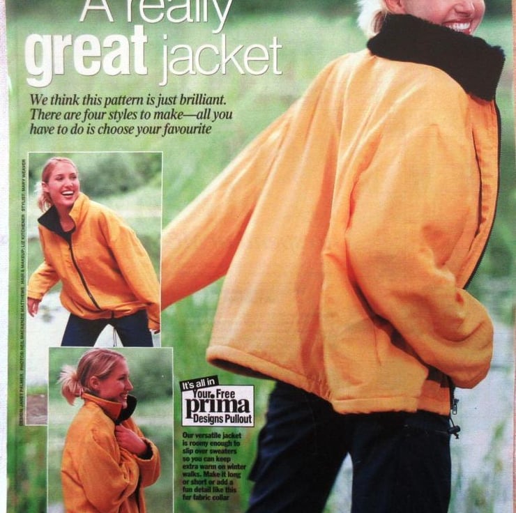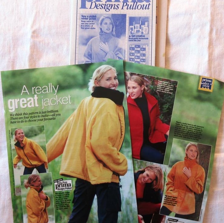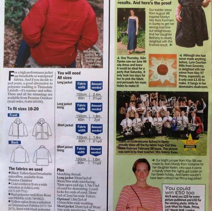 A multi-size sewing pattern for a woman's jacket in four styles and sizes 10 - 20 (bust 32.5"/83 cm - 42"/107 cm, Prima November 1998). The jacket has a front zip fastening and comes in long or short versions. The long version has a concealed zip with Velcro fastening and a drawstring waist. The short version can be padded for extra warmth. The sewing instructions ar printed on the pattern, which also has templates and instructions for wire Christmas cards.