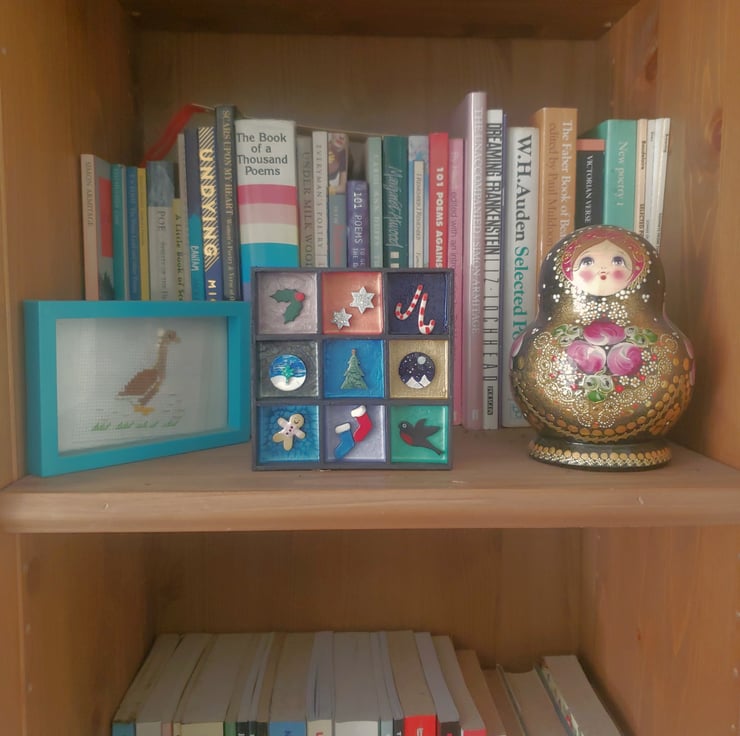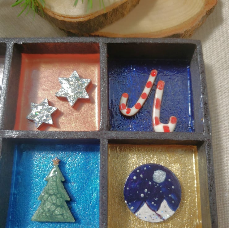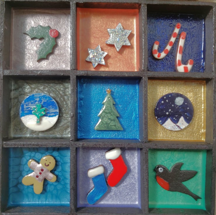 A wooden box has been repurposed and painted in a variety of colours. I've then painted and decorated small festive themed items and added to each compartment. Its a unique ornament, which could also be hung up, to add to your festive decorations.