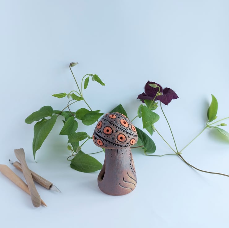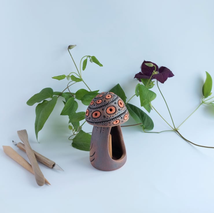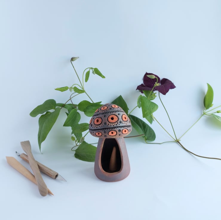 Rustic pottery Mushroom incense cone burner. Hand built with love and care. Pop in an Incense cone and watch the smoke drift up and out of the holes in the Mushroom cap.