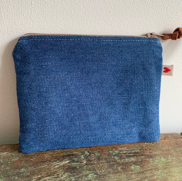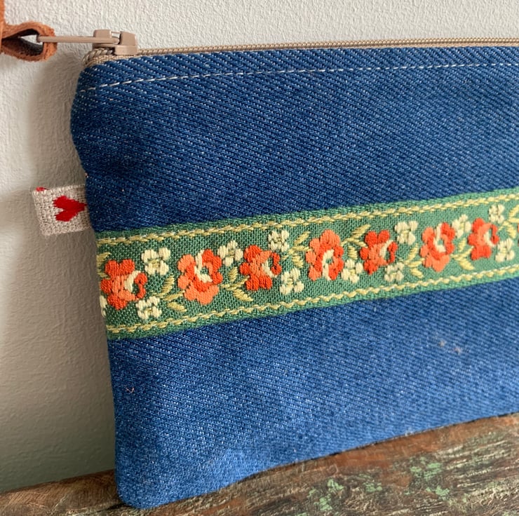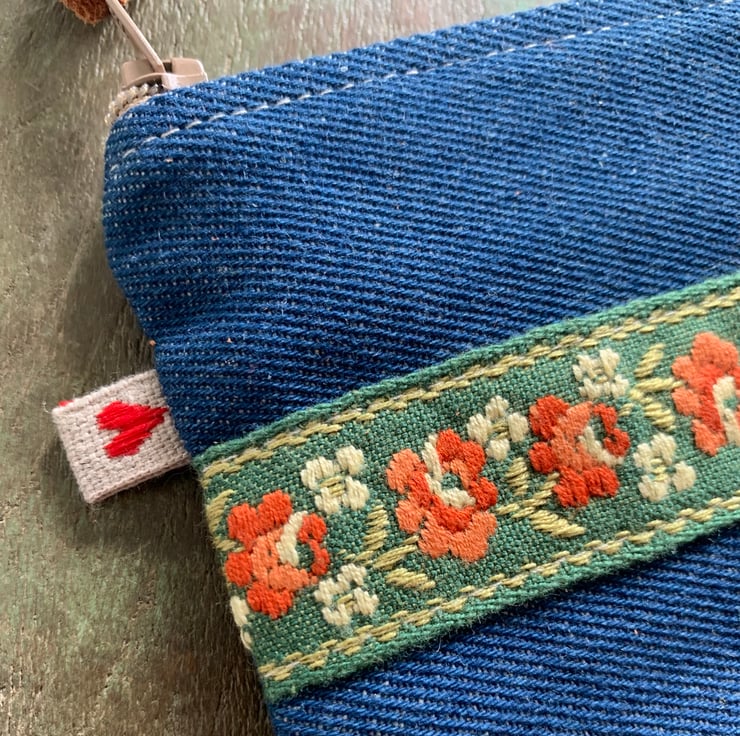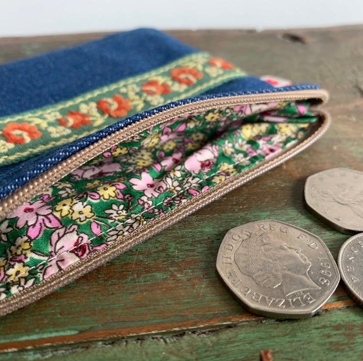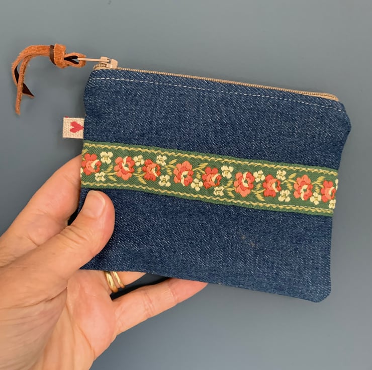 Cute little coin purse made from mid blue denim and a pretty floral braid. It is lined with reclaimed ditsy floral cotton.