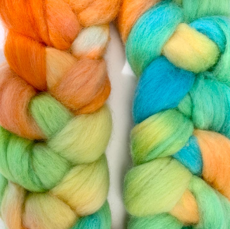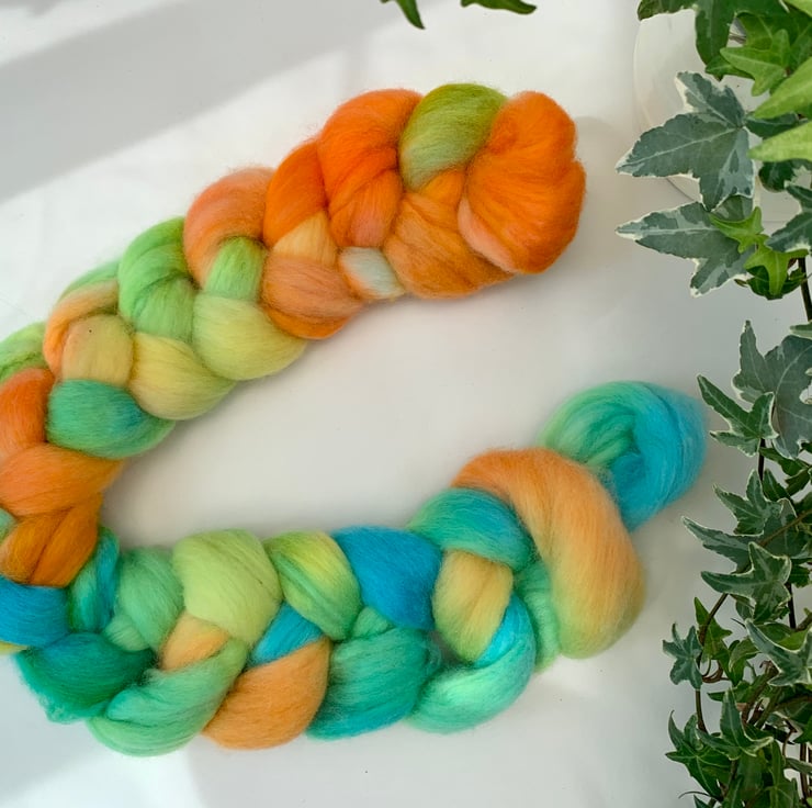90g of hand dyed Merino wool for spinning or felting. In orange, yellow, greens and blues.