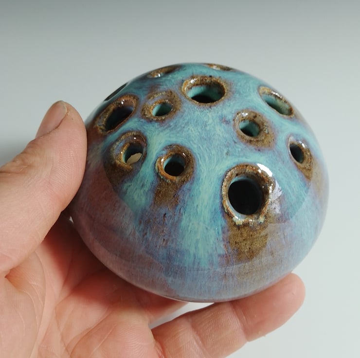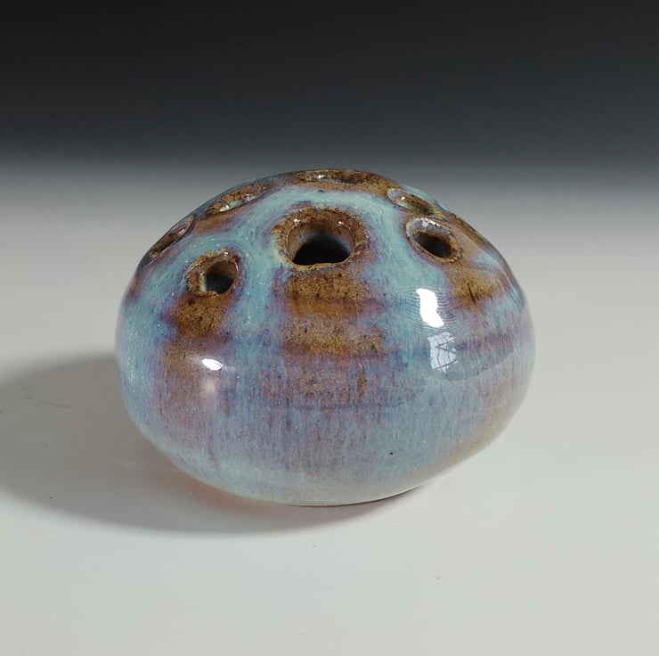 I had seen something similar years ago but made in wood with a wire mesh to poke the stems through. Then I saw a very regimented one made in ceramic that really offered no room for creativity. I thought I can improve on that by making the hole patterns more random and various sizes so that a greater selection of blooms can be displayed together.