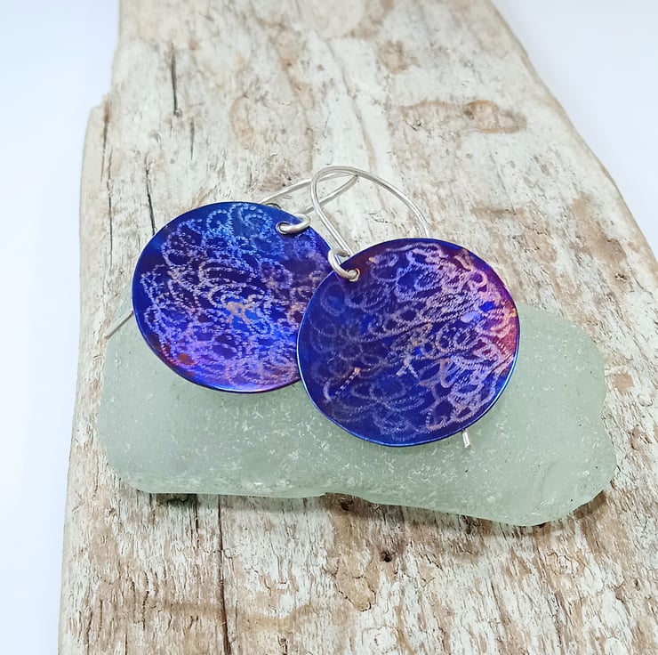 These beautiful lightweight titanium earrings display an attractive range of shades which really come to life when the light hits them.