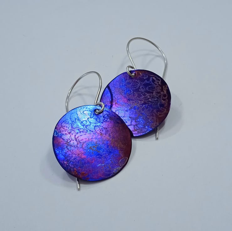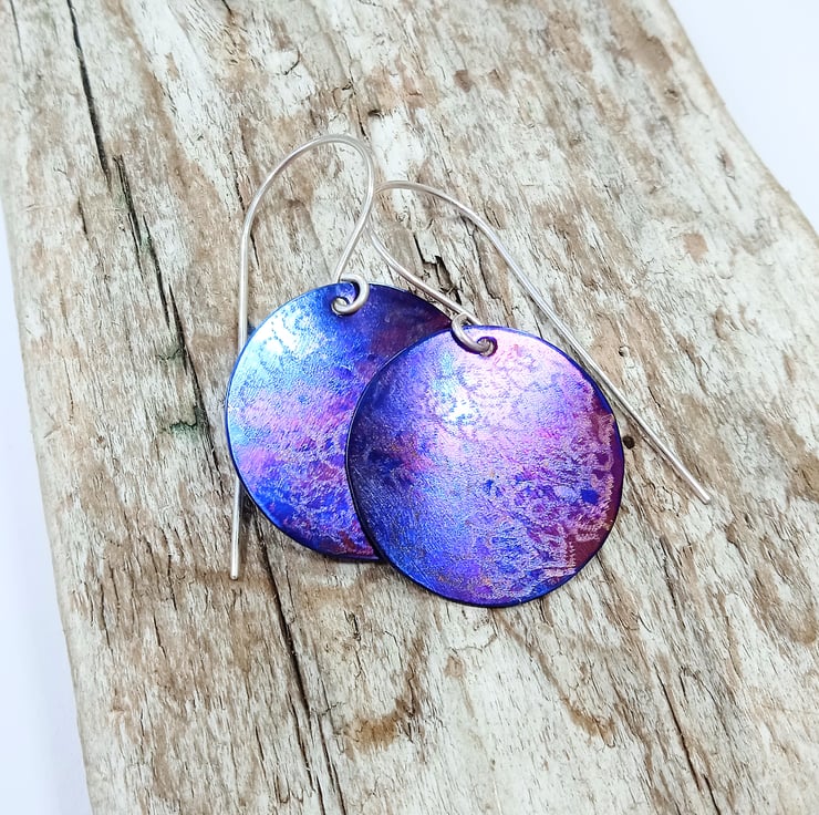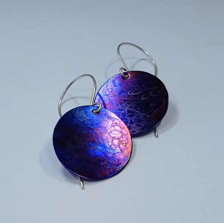 The titanium discs measure approximately 2.4 cm across and are hung from sterling silver earring wires which I have also hand made.