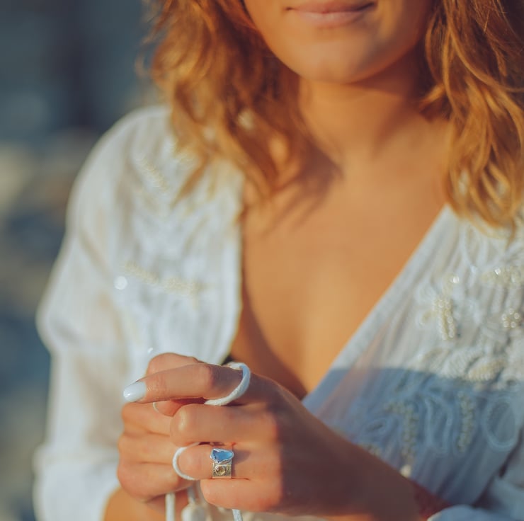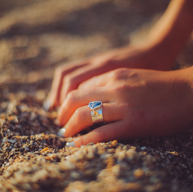 When wearing this ring you'll carry a piece of the ocean and the earth with you. Symbolising the connection between these natural elements. Creating a unique and personal accessory that tells a story.