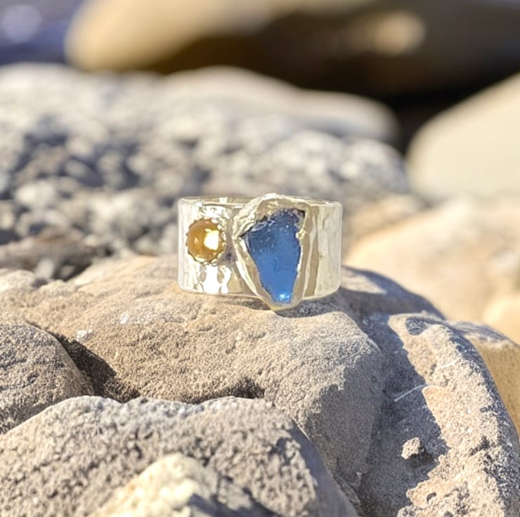 A beautiful ripping ocean sea glass ring with a sandy colour Citrine gemstone. Each ring I create is one-of-a-kind piece of jewellery. handcrafted with sterling silver 10mm-wide band. The ring features an eye-catching deep blue sea glass hand picked on the shores of North Devon. The silver ring has a hammered finish giving the ring a complete unique design.
