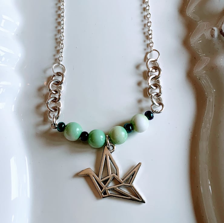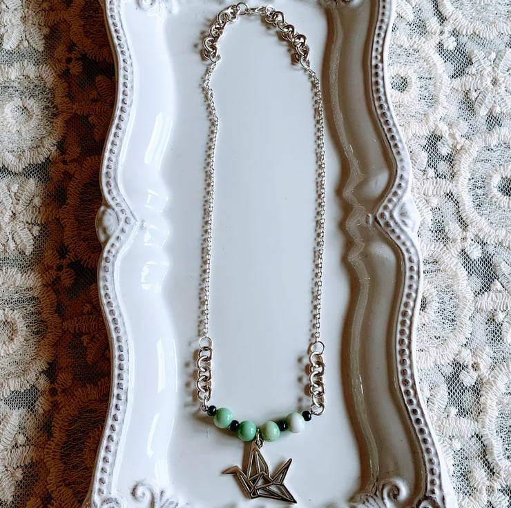 It is centred between mint green glass beads and pewter mini rochelles. It hangs on a silver plated chain that is 20 inches in length. The chain has an added design of large rings that frame the main front and back of the necklace.
