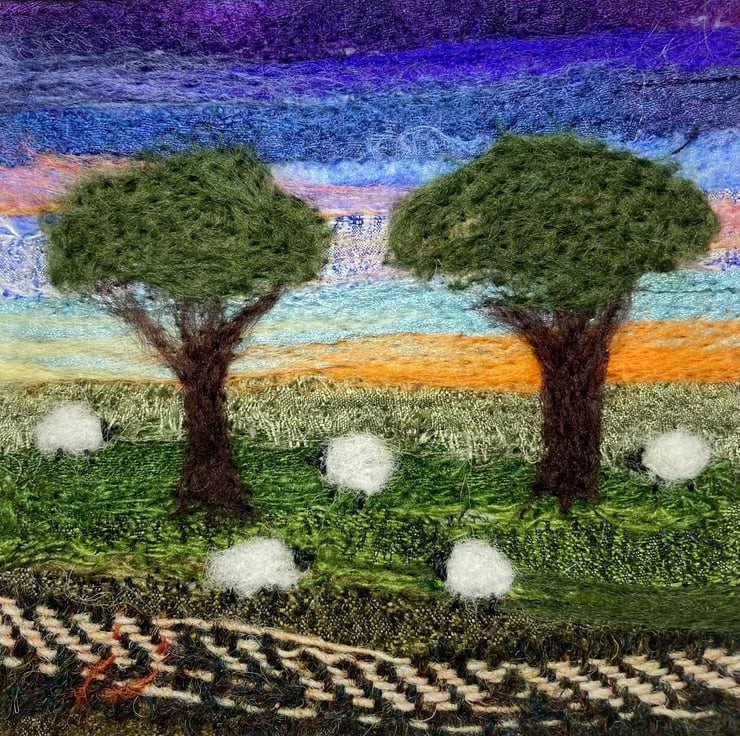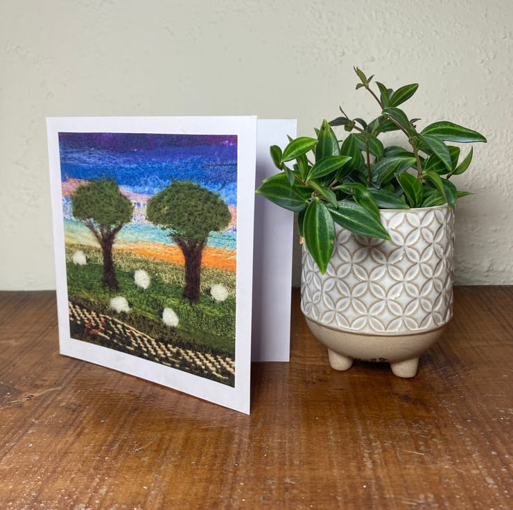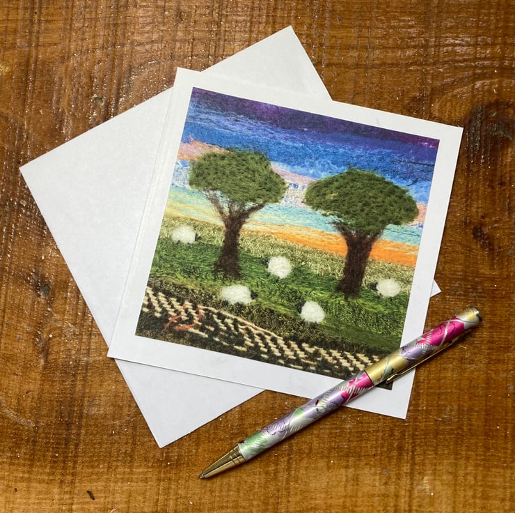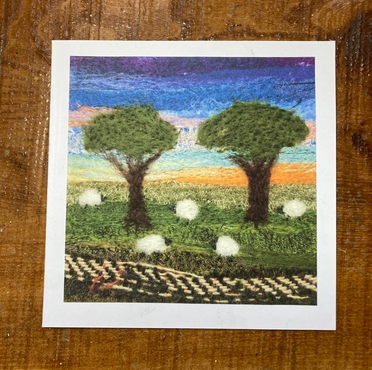 This blank greetings card has been made using a print of a piece of my original textile art. The image on this card is of sheep grazing beneath the trees at sunset. The original artwork is created using silk fabric and wool fibres needle felted to create the picture. The image has been printed on white cartridge paper and mounted onto a 5"x5" white card. The card has been left blank inside for your own message and comes complete with a white envelope.
