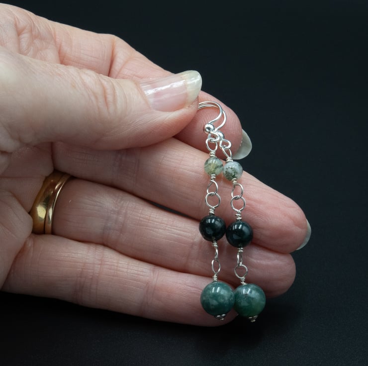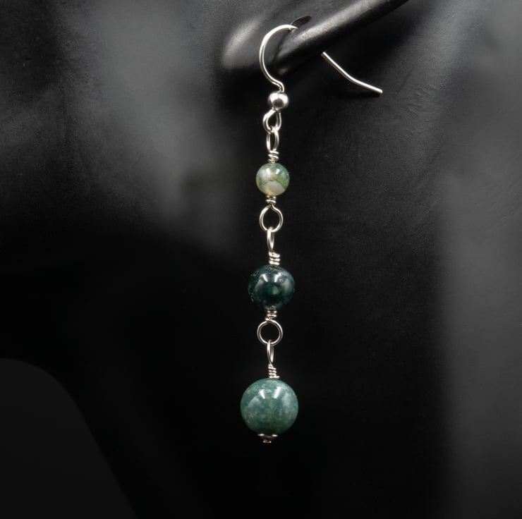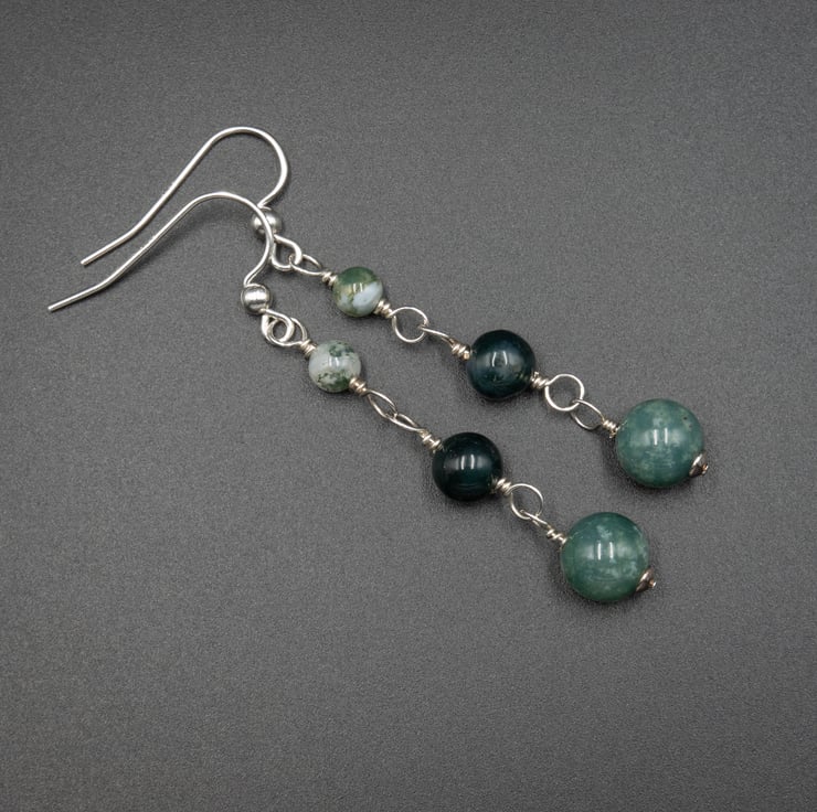 Moss agate 8 , 6 and 4mm beads are linked with sterling silver wire to form a light weight long drop of soft Spring greens.