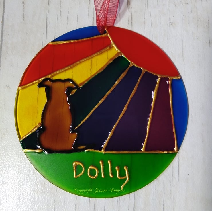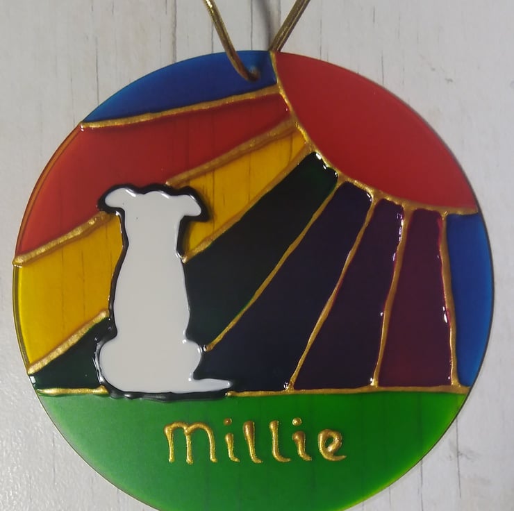 A beautiful Terrier sits in the rays of the rainbow sunshine. The dog is light brown. A single name upto 10 letters, including spaces, can be added to the grass. Outlined with gold coloured outliner. Finished with an elastic hanging cord as standard but if you prefer an organza ribbon please message me when ordering.