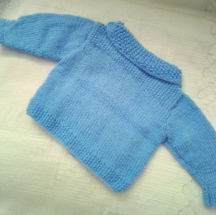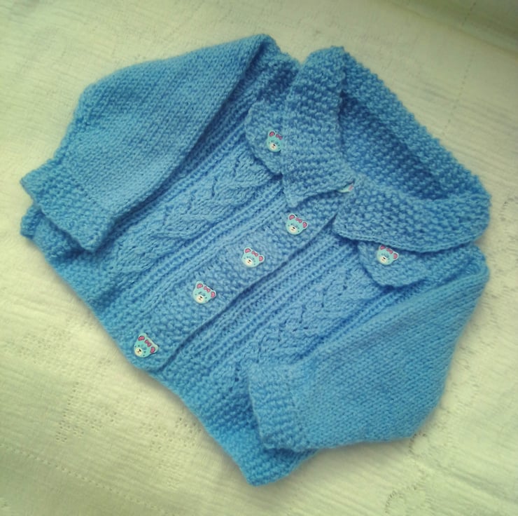 This hand knitted denim jacket is made in double knitting yarn. It would make an ideal gift for a baby shower, for a new baby or for you own little ones.