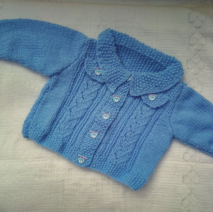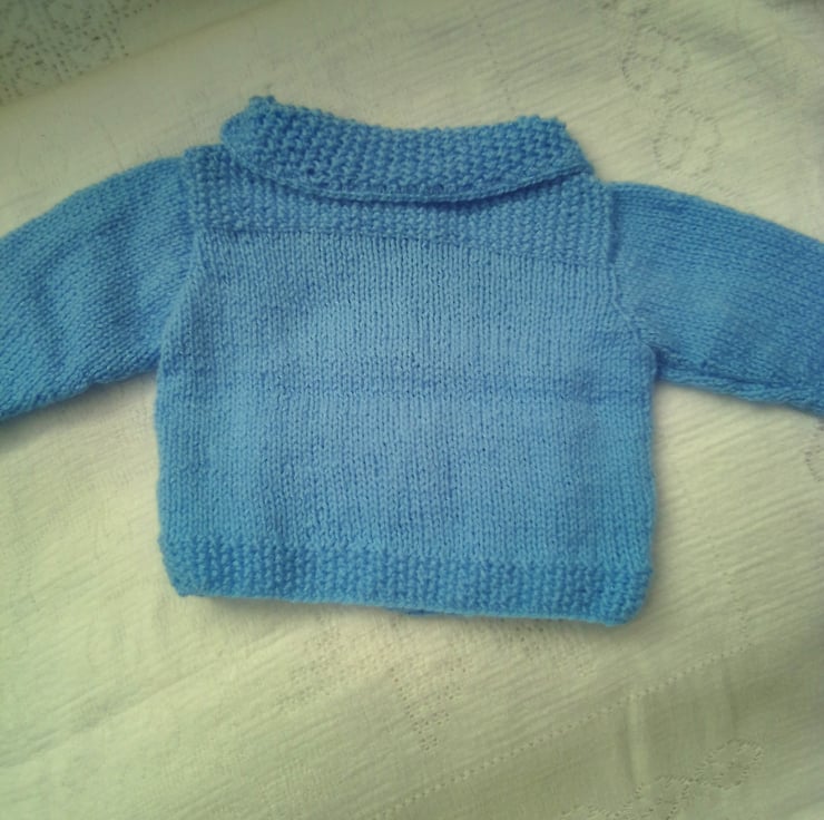 The jacket is designed to look like an adult's denim jacket. It has a patterned panel on each of the front panels and shoulders and two pocket flaps on the front. It is in stock in the blue colour shown in a size to fit a 0 - 6 month old baby, 16 inch/18 inch chest, or it can be made for you in a size and colour of your choice. Available sizes and prices are shown below. Please state the colour required when you order. The processing time for this jacket will be between 1 and 2 weeks to produce and post to you.