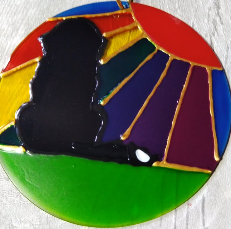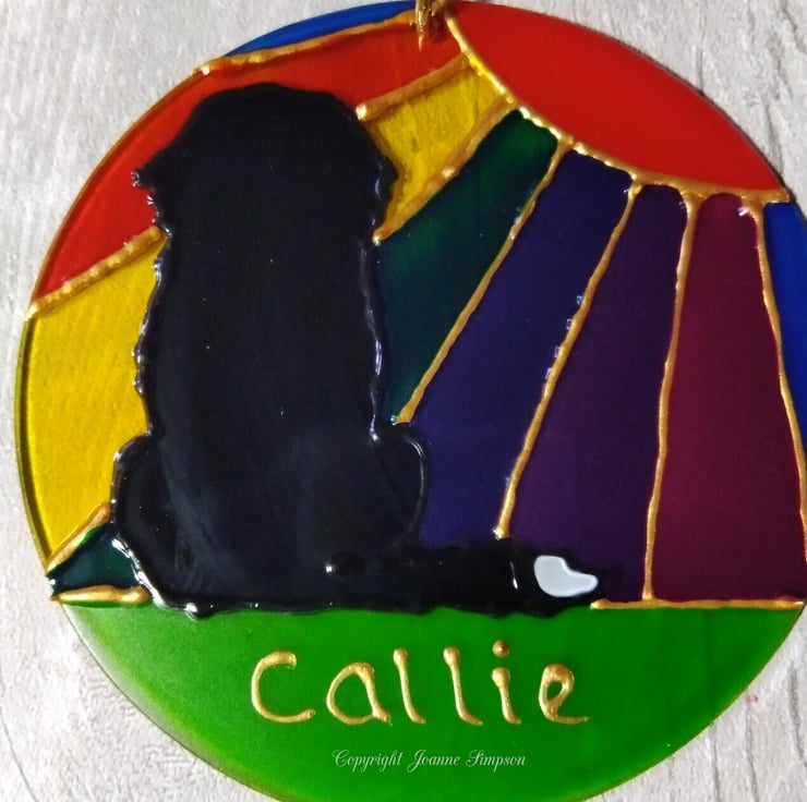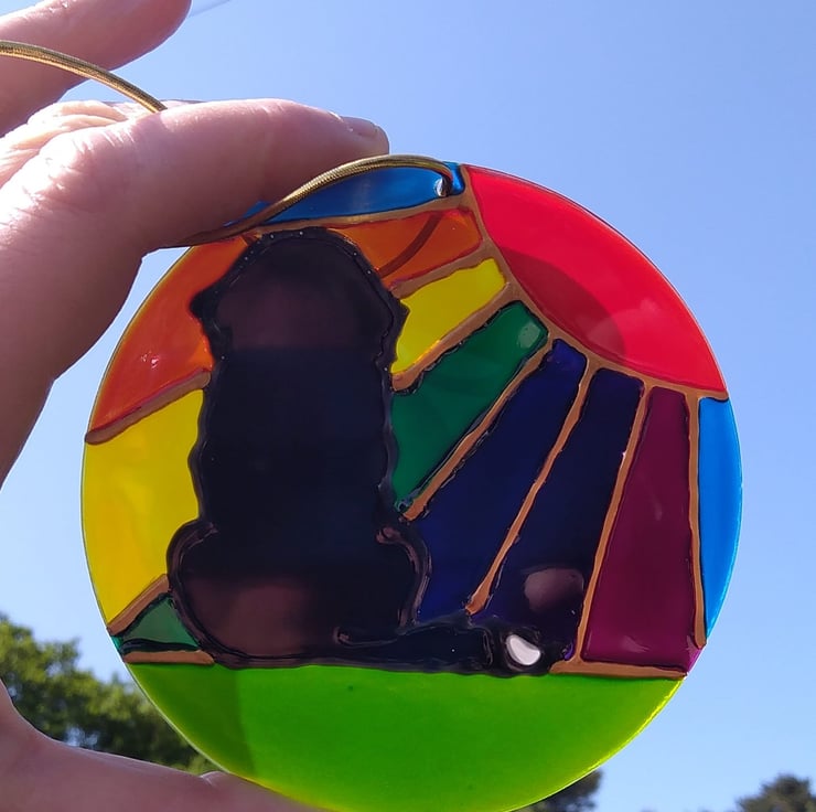 A beautiful Bernese Mountain Dog sits in the rays of the rainbow sunshine. A single name upto 10 letters, including spaces, can be added to the grass. Outlined with gold coloured outliner. Finished with an elastic hanging cord as standard but if you prefer an organza ribbon please message me when ordering.